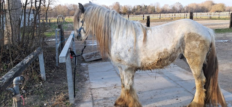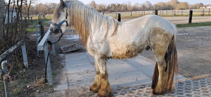 Here I am selling my nearly 4-year-old stallion. He is actually an apple-green chestnut, only turning nearly white in spring. Riding students have already sat on him while led in the field (walk and a few steps of trot), but he is not yet suitable for more advanced riding. If the buyer wishes and covers the costs, he can be lunged on-site beforehand. He is being sold solely due to a significant reduction in the herd size.