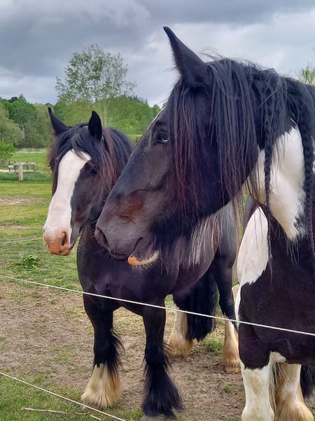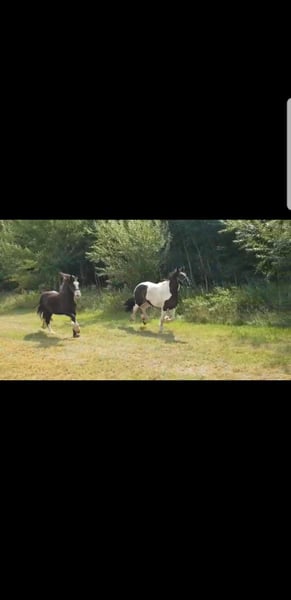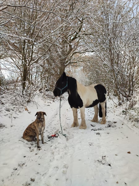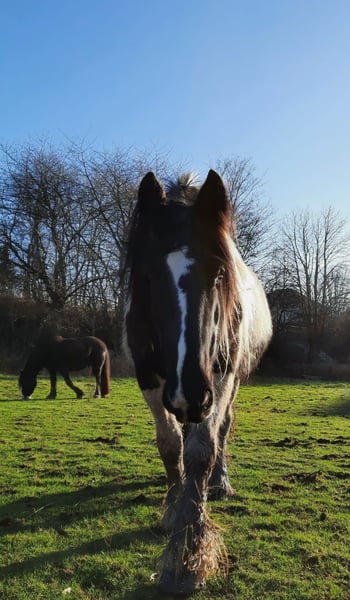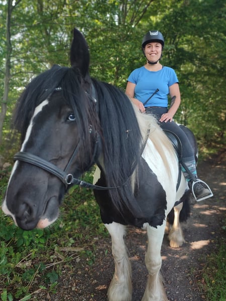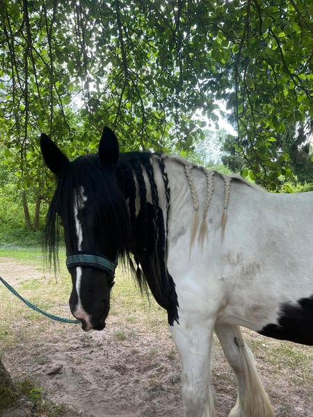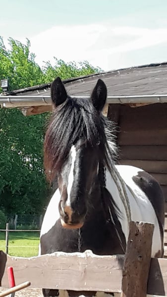 10-year-old Irish Tinker mare, 16.1 hh, registered in the studbook, excellent pedigree. All three gaits are comfortable to ride, solid basic training, ridden bitless and in English style. She has not been worked for a longer period due to personal reasons but is currently in gentle retraining. In the terrain, she has been ridden in company; with calm and loving guidance, she is very cooperative. Loyal character, attentive, she needs a rider who can provide her with security. Halter and farrier familiar, she sometimes tests boundaries – but with calm consistency, very manageable. Healthy and fit, she is currently being treated for mud fever on her lower legs. Strikingly beautiful appearance with a blue eye – a real eye-catcher! Includes accessories: well-fitting saddle (adjusted two years ago), bridle, halter with lead, grooming kit, rugs, and other equipment in good condition. Feel free to contact us with questions or if you're interested! We look forward to meeting you!