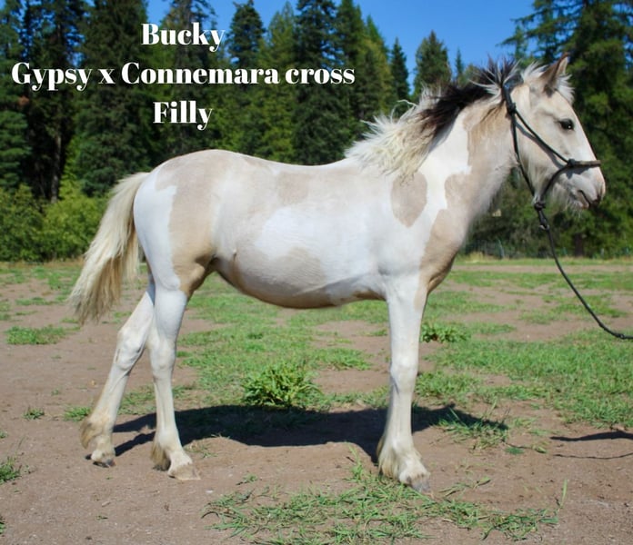 “Bucky” is a stunning Buckskin Tobiano filly! Out of 3 time world champion Gypsy Vanner Stallion and very fancy Connemara cross dam this girl has everything you look for in this cross! Great bone, lots of hair, gorgeous build, incredibly intelligent, wonderful mover this girl is special! Estimated height around 14 hands. Bucky is very friendly, loves itches, she is a best friend girl! Very level minded has already completed an obstacle course! Does all basics including picking up 4 feet, tying, loading. This girl has a wonderful minds! DOB March 18 2025