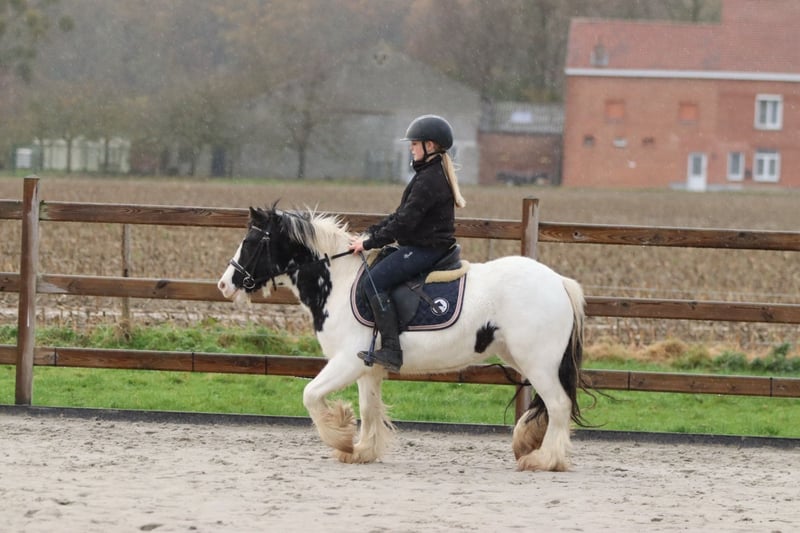 Evie 🌸 Very sweet 4-year-old mare pony – 1.26 m This beautiful young mare does not at all give the impression of being only 4 years old. She moves very nicely and effortlessly in all three gaits and jumps with great ease. She rides out comfortably without any issues: she is not spooky and behaves impeccably on the road. Additionally, Evie is bombproof – see the photos and videos with the ball – and always remains calm and reliable. In handling, she is incredibly gentle and patient. She stands perfectly still for tacking, grooming, drying… In short: a true children’s and family pony. She gets along well with other ponies and is very easy to transport. More info? 📞 +32 475 68 22 43 Videos can be viewed on our website – feel free to request the link!