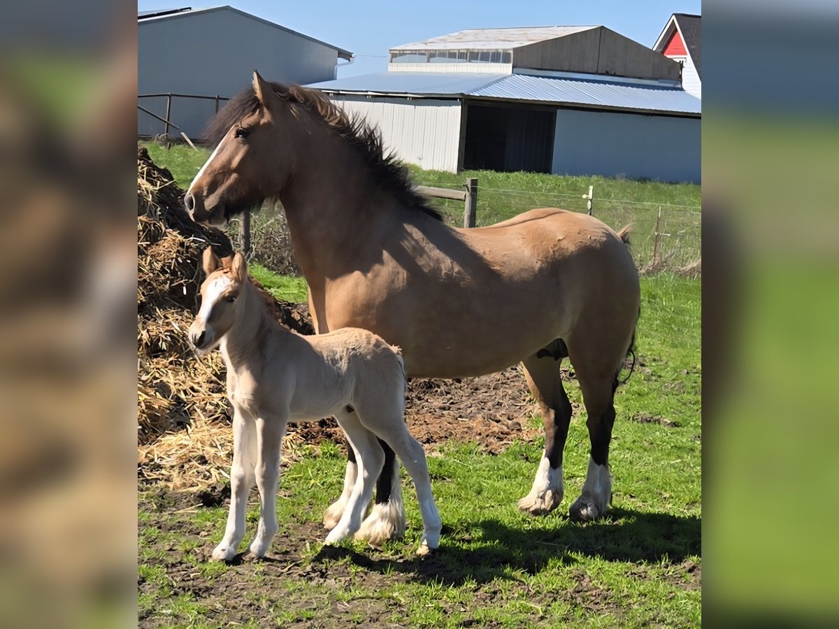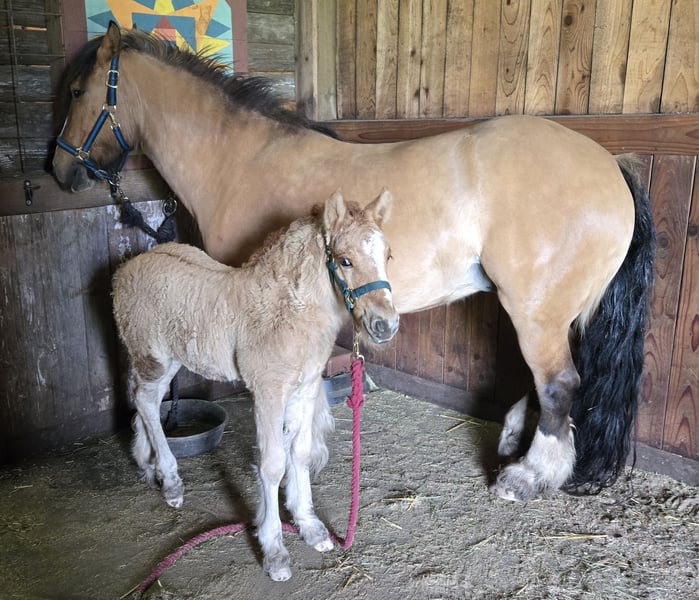 For your consideration, this amazing mare and her stud colt. First, Sienna is a 4 year old gorgeous and sweet little bay dun mare. Her ground works done and has been saddled but has not been started with a rider yet. She is: 1/2 GV (Sire is SRS Deagan) 1/2 Highland Pony (Dam Lussa of McClellan) Highlands are an incredible and rare breed Estimated to mature at 14HH Sienna has beautiful movement, she has so much potential. Eligible for double registration . Her gorgeous colt arrived on March 21st, by GV Flavio Bailey's Cream. The colt has huge bone and is a red roan dun (his Sire is homozygous for roan) He is 3/4 Gypsy Vanner 1/4 Highland Pony. SD lines top and bottom. Please message for additional information and pictures. Located in Willamette Valley area in Oregon.