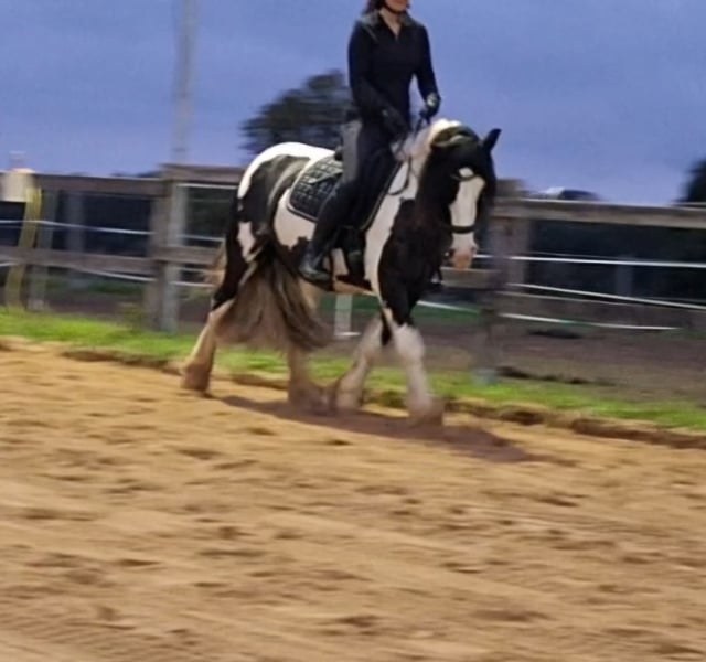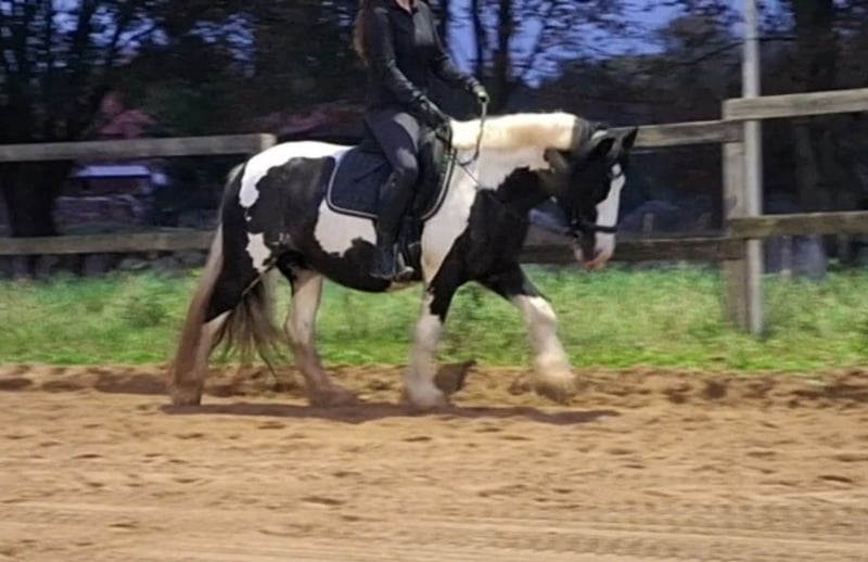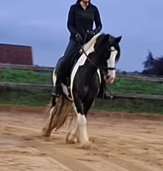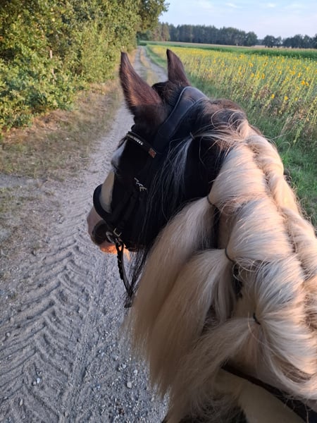 We are offering our wonderful Tinker mare – ideal for dressage and leisure riding. This beautiful Tinker mare was born in 2018 and stands approximately 150 cm tall. She has been trained by us in a gentle and versatile manner and is comfortable riding both in groups and alone in the terrain. She shows talent for dressage. Due to her young age, she is not suitable for beginners or as a children's riding horse at this time and requires a rider who can provide her with confidence. The mare is friendly in handling, well-trained, and demonstrates great talent and willingness to learn. Perfect for riders looking for a horse with a big heart. If you are interested or have further questions, please feel free to contact me. A trial ride is possible for a fee of 35 euros.