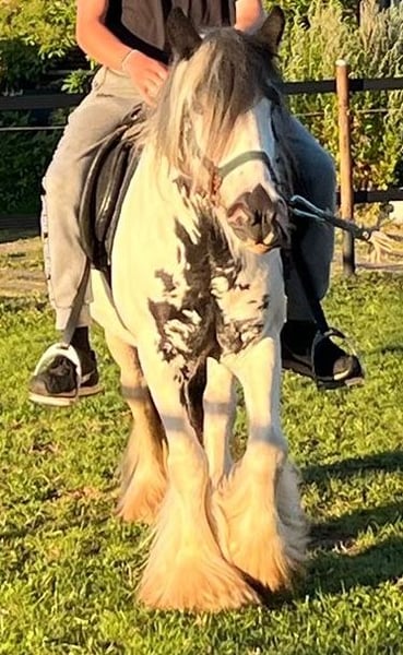 Partenaire de loisirs au caractère calme et au potentiel prometteur Tuffy est une jument Tinker amicale et très proche de l'humain (née en 2017), dont le tempérament équilibré et la nature agréable séduisent au quotidien. Elle est manipulable à la licol, connaît aussi bien le paddock que le box, et évolue en toute sécurité dans le groupe au rang moyen. En contact, elle se montre simple et coopérative. Tuffy a déjà été montée et connaît le travail à cheval en général. Cependant, ces deux dernières années, elle n’a pas été régulièrement entraînée et se trouve actuellement de nouveau en mode loisir. Avec un peu de temps, de patience et un travail cohérent, elle pourra facilement être remise en selle. Ce n’est pas une monture pour débutants au sens strict, mais elle recherche une personne de confiance, prête à continuer à travailler avec elle et à la faire progresser étape par étape. Ainsi, elle pourra devenir une partenaire de loisirs formidable. Elle apparaît à droite dans la vidéo. La vente s’effectue pour des raisons d’âge, dans le cadre d’un aménagement de la propriété suite à une réduction du cheptel, qui a été constitué au fil des années. Il ne s’agit en aucun cas d’une vente d’urgence. Si vous êtes sincèrement intéressé, n’hésitez pas à nous envoyer un message ou à nous appeler.