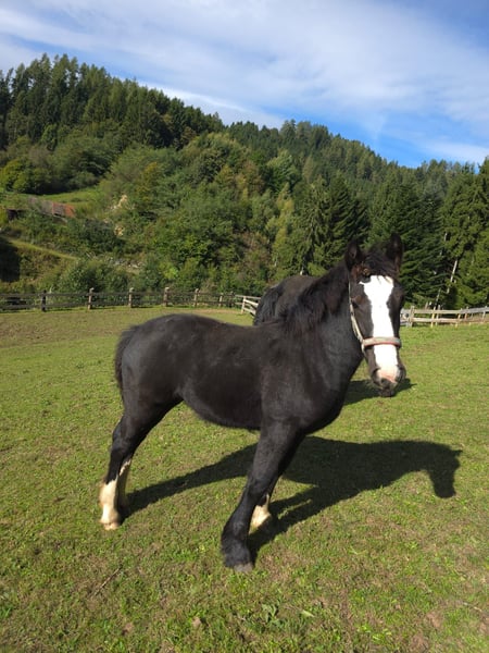 Beautiful Tinker mare Fanny, born on May 5th, 2025, is looking for her new dream home. Fanny is an elegant black beauty with a distinctive white blaze and a white sock. She is naturally somewhat shy but is very gentle and eager to learn in her interactions. With the right handler, she quickly builds trust and wants to please. She is an excellent partner for people who appreciate a sensitive, refined horse and prefer to work with calmness and patience. Profile: Date of Birth: 05.05.2025 Breed: Tinker Gender: Mare Color: Black with white markings (blaze, sock) Temperament: Calm, sensitive, gentle Fanny is perfect for someone who desires a close bond with their horse and enjoys nurturing and developing a young horse.