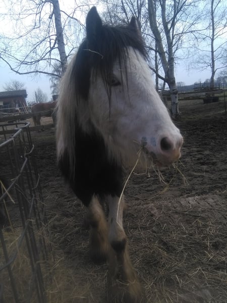 Z ciężkim sercem sprzedajemy naszego George'a. Mały książę „George” jest z nami od około pół roku. Urodził się w Anglii i stamtąd trafił do nas przez holenderski targ koni. Wychował się w stadzie z rówieśnikami, starszymi ogierami oraz starszymi wałachami i klaczami, w różnych rozmiarach. Od czasu młodszego źrebięcia nie miał żadnych złych doświadczeń i nigdy nie był chory. Stoi na podwórku w boksie z wybiegiem, latem na zadrzewionej pastwisku w grupie stada. Zna również stajnię (z powodu bardzo zimnych zim, urlopów). George był wyprowadzany na jazdę w terenie, jeździli na nim dzieci na siodłach, był też w wakacje nad jeziorem, jako koń do towarzystwa podczas wycieczek czy przy lodziarni. Uwielbia taplać się w płytkiej wodzie, kopać w niej lub się w niej ochładzać. To prawdziwy koń marzeń. Zawsze był wesoły, przyjazny i łagodny, spokojny przy czyszczeniu i transporcie, a także przy siodle (nawet podczas jazdy w terenie). Dzięki swojej spokojnej naturze daje poczucie bezpieczeństwa i jest prawdopodobnie odpowiedni dla dzieci lub do terapii. Ze względu na studia córki i własne dolegliwości, niestety musimy zrezygnować z całej hodowli koni, dlatego zdecydowaliśmy się na jego sprzedaż. Przez cały okres nie był chory ani kulawy. Nie miał kolki, nieznanych kulawizn, zapaleń kopyt, atopii czy egzem. Podczas jesiennego zarażenia roztoczami pastwiskowymi jego sierść została usunięta. Nie miał problemów z gęstą grzywą, ogonem czy kończynami. Jego urok to lekki wąs zimą i piękne oczy. Szukamy dla tego sercowego konia stałego, pięknego domu. Posiadamy również mały wózek konny i lekkie uprzęże, które można nabyć przy zainteresowaniu. (Badanie weterynaryjne na koszt i za zgodą zainteresowanego możliwe na miejscu. Ze względu na stan wytrenowania, jazda próbna nie jest możliwa). Sprzedaż jest spowodowana rezygnacją z hodowli koni. Dane techniczne: Rasa: Tinker Płci: wałach Wysokość: około 1,28 m Urodzony: listopad 2016 – jeszcze 9 lat Obfity kończynowy włos Długa grzywa i ogon Niebieskie oczy Ważny paszport – bez rodowodu Wytrzymały na jazdę w terenie i na placu – wymaga ponownego wyprowadzenia Na zdjęciu widoczny jest również norweski koń i siwek Shetland, które również szukają domu i są wystawione na sprzedaż. Więcej informacji, zdjęć, filmów itp. pod numerem 0157-55791316.
