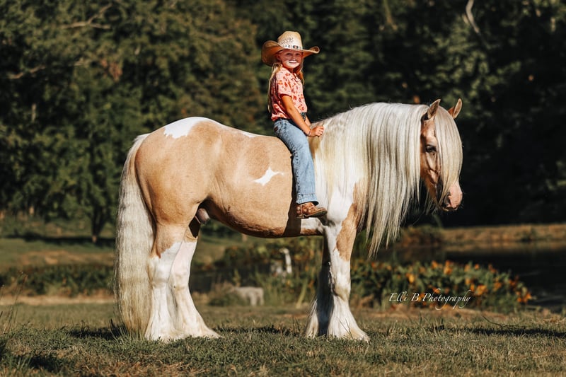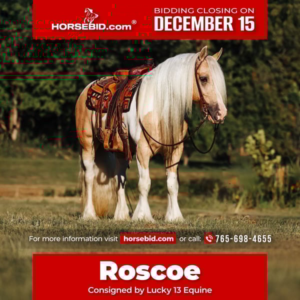🎄𝐓𝐇𝐄 𝑯𝒐𝒍𝒊𝒅𝒂𝒚 𝐂𝐋𝐀𝐒𝐒𝐈𝐂🎄 Happening now thru MONDAY | DECEMBER 15th - Available EXCLUSIVELY on HorseBid's website! For more details and to register visit: www.Horsebid.com CONSIGNOR CONTACT: Lucky 13 Equine 765-698-4655 LOCATION: Mount Vernon, KY BREED: Gypsy Vanner REGISTERED: No COLOR: Palomino and white paint HEIGHT: 14.3 AGE: 9 GENDER: Gelding Meet Roscoe, a breathtaking 9-year-old Gypsy Vanner gelding standing 14.3 hands tall. His gorgeous palomino-and-white coat and classic Gypsy build make him an instant standout, but it’s his mind, training, and versatility that truly set him apart. Roscoe is an absolute gentleman on the trails steady, confident, and sure-footed across all kinds of terrain. Whether you’re out for a quiet evening ride or exploring new country, he stays relaxed and dependable. He’s also been to town and through busy environments, taking traffic, crowds, and commotion in stride. In the arena, Roscoe shows off his training. He takes both leads, stops, backs, turns around, side passes, and stays soft in the bridle. He has also been used extensively at exotic animal sales, moving every type of animal you can imagine. Working gates in that environment has made him extremely handy, responsive, and adaptable. Roscoe truly offers the best of all worlds beauty, brains, and a big, willing heart. He’s versatile enough for trail riding, pleasure riding, English, dressage, jumping, or driving, and kind enough for riders who want a trustworthy partner with a little extra style. If you’re looking for a stunning, well-trained, and dependable gelding that can fit into almost any lifestyle, Roscoe is your horse. Opportunities to own one like him don’t come around often!