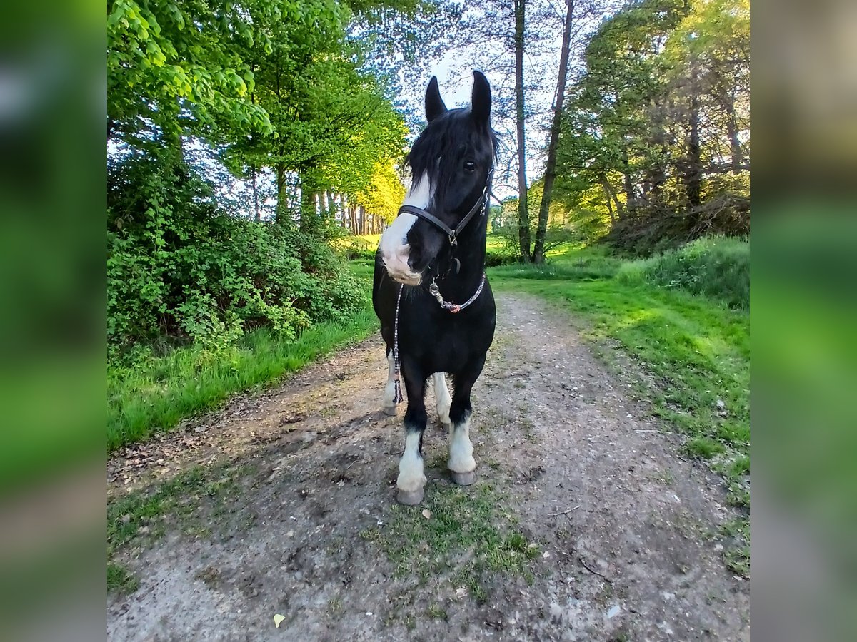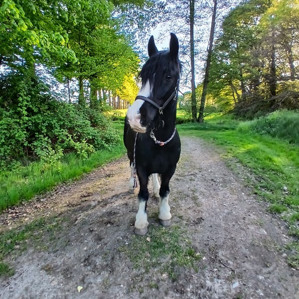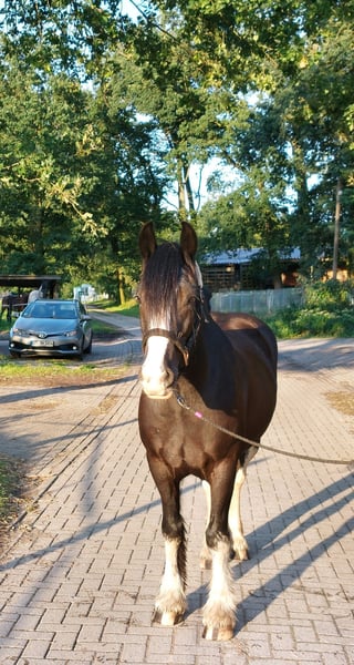 Our 10-year-old gelding, a Tinker, is seeking a new, nurturing home. He stands at 1.50 meters and has gained experience in both jumping and dressage. He has competed successfully in show jumping competitions, handling the courses very well and with ease. He loves to jump and remains consistently motivated during this activity. In dressage, he is also pleasant to ride. He is very gentle and easy to handle, getting along well with children. He is comfortable being ridden by children and is very cautious and attentive when working with them. However, he still needs a stable primary handler, as he can become uncertain without one. He is accustomed to riding out alone or in groups and has been driven single and double. He is loading well and stands calmly for the farrier. Additionally, he is familiar with ground work and trail riding, showing great interest in both. He is herd-compatible with mares, geldings, and stallions. He has equine asthma, which, with appropriate management such as dust-free environment, high-quality hay, and/or turnout in an open stable, does not limit him.