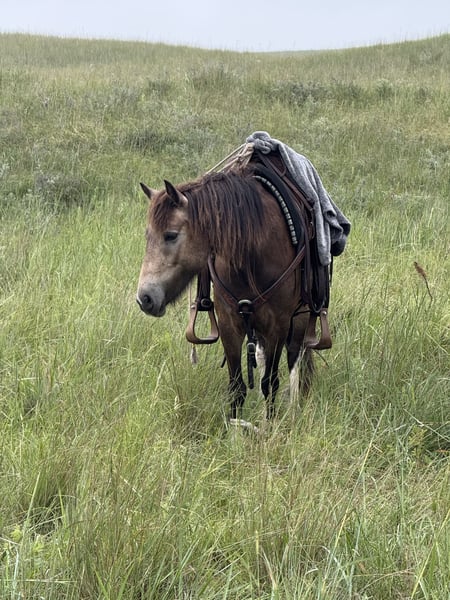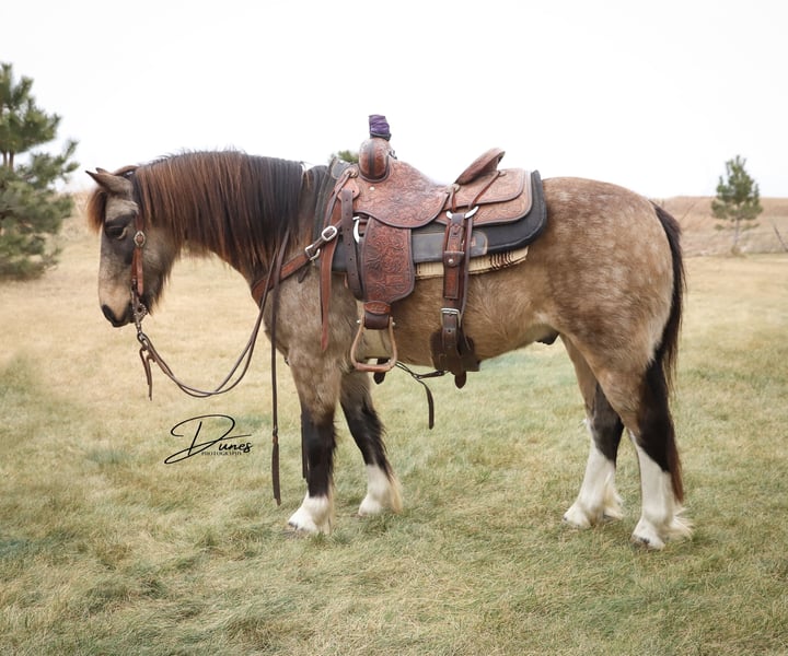 🎄𝐓𝐇𝐄 𝑯𝒐𝒍𝒊𝒅𝒂𝒚 𝐂𝐋𝐀𝐒𝐒𝐈𝐂🎄 Happening now thru MONDAY | DECEMBER 15th - Available EXCLUSIVELY on HorseBid's website! For more details and to register visit: www.Horsebid.com CONSIGNOR CONTACT: Dunes Horsemanship LLC 308-262-5020 LOCATION: Thedford, NE BREED: Gypsy Cross REGISTERED: No COLOR: Buckskin HEIGHT: 13.2 AGE: 3 GENDER: Gelding Wheezy is a three year old Gypsy cross with just enough feather and foot to make him look fancy, without all the upkeep that comes with the full blood gypsies! He stands 13.2 and his feet are big enough to make some quarter horses blush! He is currently giving his best impression of a wooly mammoth, but he sheds out into a dark buckskin in the spring and hangs onto those big pretty dapples! Nowhere in my plans did I have offering Wheezy written down, and believe me when I say, it breaks my heart to let him leave, but he is simply too good to keep hidden away here in these hills when he will bring so much joy to a family needing something safe, sound, and reliable. Wheezy walks out like a big horse and has drug a handful of calves at brandings this spring, gathered pastures as the sun came up, and meandered through town this summer. He knows his leads, is starting to get his flying lead change figured out, has a fancy little spin, and is nice and soft in either a bridle or just a halter. He will cross water, loads and unloads with ease, and would halter himself if he had thumbs. He is an absolute pet and loves to be in your pocket any chance he gets. Though he is young, he is an old soul and has never once left me feeling unsafe. Brush the snow off his back and crawl on. He will get you to and from safe and sound! I truly feel he would be suitable for anyone ready to step up from that old faithful to a young and eager yet SAFE gelding. Wheezy is still perfecting his neck rein, but he is the PERFECT project for your little one who is ready to finish their own horse their way, without the risk of starting a colt from scratch. He has a fantastic foundation and is ready for his next family. He has packed kids around some in the arena and is ready to find his forever family with hopefully a handful of kids to teach to love horses! Wheezy has been an absolute joy to have and anyone who is lucky enough to bring him home, will be certain to never find another like him! As with any of our horses, please bring him back at any time for a refresher should you ever feel the need, or just to brush off the cobwebs after a long winter. We want nothing more than for Wheezy to be loved and enjoyed by his new family and we we will go above and beyond to make sure he find his forever! Please reach out with any questions you may have or to come take him for a spin! Tess Chytka Dunes Horsemanship LLC 308-262-5020