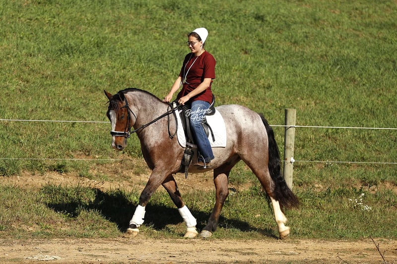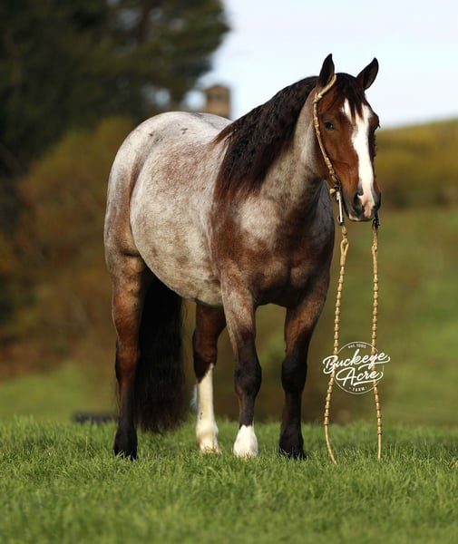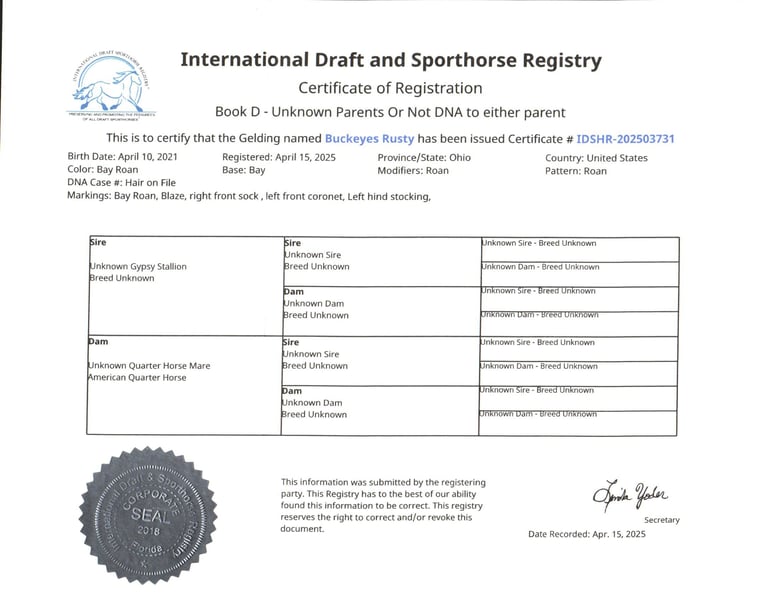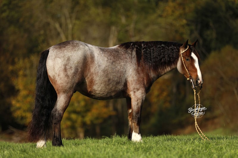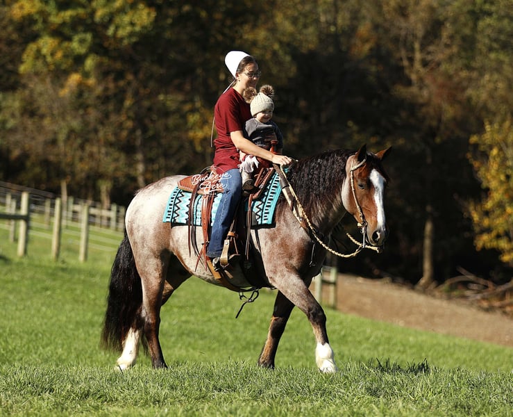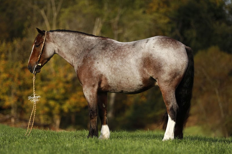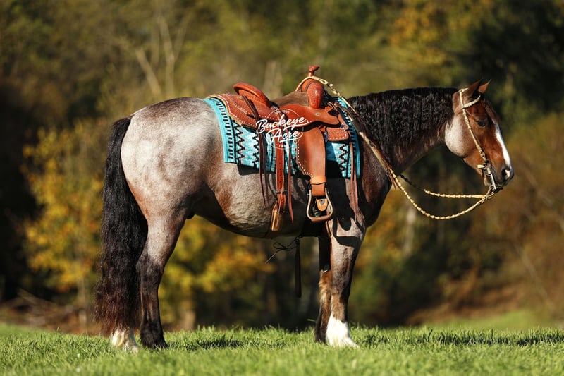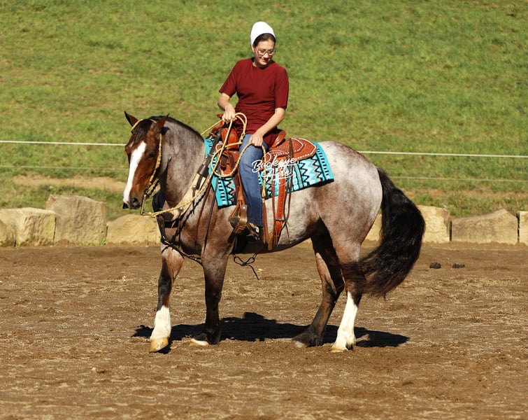 What a sweet individual we have to offer you! Rusty truly lives up to his name — that rich red roan coat gleams like polished copper, giving him the warm, “rusty” glow that makes him stand out wherever he goes. His size, color, and personality do not come around very often, and it is easy to see why everyone falls in love with him. Rusty is a 2021 model Gypsy/Quarter Horse cross standing at that just-right size of 14.3 hands. He has built to last with correct conformation, a kind eye, a thick bushy tail, two white socks, and a striking white blaze that completes his handsome look. From the moment you meet him, Rusty’s sweet and gentle nature shines through. He is the first to meet you at the gate, ears forward and waiting for a good scratch or a pat on the neck. He loves people, enjoys being brushed and fussed over, and is always eager to please. He has that calm, old soul personality that is hard to find — confident, patient, and kind, whether you are on his back or simply standing by his side. Rusty has been ridden Western, English, and bareback. He is just as happy working in the indoor or outdoor arena as he is out exploring new trails. He has been on countless miles through the woods, across creeks, over logs, up and down hills — taking it all in stride, sure-footed and steady every step of the way. Rusty is the kind of horse that does not get in a hurry but will move out willingly when asked. He is smooth, balanced, and dependable, making every ride a relaxing and enjoyable experience. Whether you want a quiet companion for a relaxed trail ride, a dependable partner to take down the road, or a fun, versatile horse to enjoy in the arena, Rusty fits the bill. He side-passes to make mounting easy, knows his leads, and moves willingly off leg pressure. His walk, trot, and canter are all smooth and easy to ride — you can sit him all day without getting tired. He rides with a nice, soft one-hand neck rein and stays quiet under saddle no matter what you are doing. Rusty has been exposed to about everything he is desensitized to tarps, jugs, gunshots, and whips. He has been on state roads and through traffic, staying calm and steady. He has even learned a few fun tricks, like laying down and sitting up on command, showing just how intelligent and willing he is. He is great with kids, loves attention, and does not require daily riding to stay the same. Give him a few days or even a few weeks off, and you can saddle up and go — he will be the same sweet, dependable gelding every time. Rusty is up to date on all his deworming, vaccinations, and shoeing. He is one of those rare horses that truly has it all — the looks, the build, the color, and the mind to match. If you have been looking for a loyal partner who is as honest as the day is long, Rusty is ready to meet you at the gate with his big heart and quiet confidence. If this sounds like the horse that you have been looking for, please feel free to reach out to Duane @ 330-231-2324 for more information or to meet him in person.