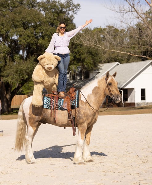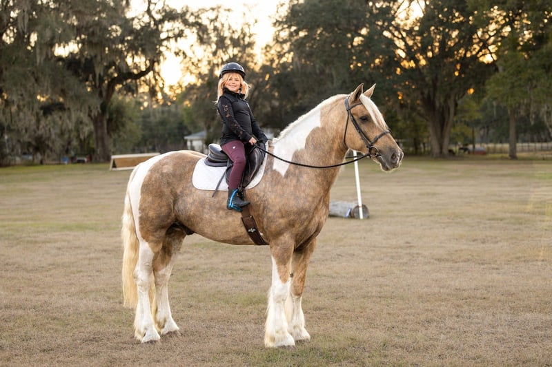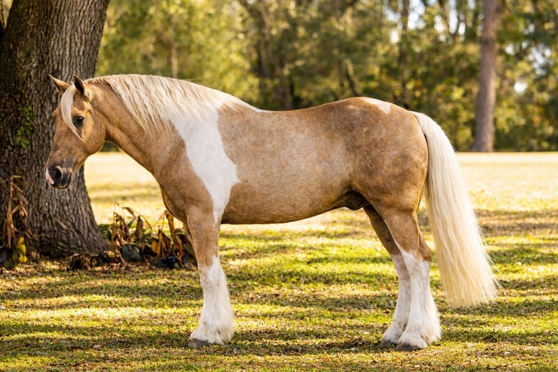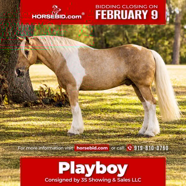 ❤️🔥𝑩𝒆 𝑴𝒊𝒏𝒆 𝐒𝐄𝐋𝐄𝐂𝐓❤️🔥 Happening now thru MONDAY | FEBRUARY 9th - Available EXCLUSIVELY on HorseBid's website! For more details and to register visit: www.Horsebid.com CONSIGNOR CONTACT: 3S Showing & Sales LLC 919-810-0760 LOCATION: Ocala, FL BREED: Gypsy x Percheron REGISTERED: No REGISTERED NAME: Playboy COLOR: Palomino Paint HEIGHT: 16.2 AGE: 6 GENDER: Gelding MEET PLAYBOY A 6 year old 16.2 HH Gypsy Vanner × Percheron palomino paint gelding who turns heads everywhere he goes. With just the right amount of feather to be both gorgeous and low maintenance, he is as eye-catching as he is practical. This stunning gelding has the kindest expression and an even kinder mind. Playboy has been extensively exposed to real-world situations and excels as a true all-around horse. He has been ridden on the large open cross country course, where our 8 year old rider confidently jumped logs and took him through water all by herself, and we have also ridden him double on the cross country field. He has completed full obstacle courses, including teeter-totter bridges, pool noodles, traffic, and a variety of challenging elements. He has been around cattle, helped gather longhorns, and while he may be a pretty boy, he truly loves to chase the cows. He is completely comfortable with loud semi-trucks, heavy traffic, construction noise, and busy environments. He has even been ridden at night through colorful smoke bombs, to McDonald’s, and to local food stands. Under saddle, Playboy rides both Western and English and has started basic dressage work, learning to move off the leg and beginning the foundations of collection. He has comfortable, smooth gaits with an exceptional jog and an easy, rhythmic trot, along with a forward, marching walk. Playboy jumps in beautiful form and keeps the same steady rhythm coming in, over, and away from the fences. He is not a lazy horse and not a hot horse — he falls right in that perfect in-between, making him incredibly easy and confidence-building to ride. The kids absolutely love him because he does not require constant leg, and they are happy to cruise along in that beautiful slow jog all day long. While Playboy is a certified true all-arounder, someone could absolutely choose to finish him in a single discipline if they wish — whether that be hunters, lower level jumpers, dressage, driving, ranch riding, or keep him as an all around pleasure mount — but his versatility is what truly sets him apart. With his size, brain, bravery, and exposure, he could even go in the direction of being a police horse. On the ground, Playboy is just as easy as he is to ride. He loads, ties, and cross-ties quietly and is polite and well-mannered for daily handling and grooming. He is an easy keeper, currently wears front shoes only, and turns out happily in a mixed herd. Playboy has been ridden by both our 8 year old and 10 year old riders, as well as multiple other kids, and absolutely loves his job. Our 10 year old never wants to get off him, and he remains kind, forgiving, and trustworthy, making him a wonderful partner for junior or amateur riders while still being enjoyable and fun for more experienced riders as well. ✨ Ladies — enjoy your English ride, then throw your husband on him in a Western saddle and head down the trail. He truly does it all. And yes… he is a real-life couch to sit on. ✨ In addition, Playboy has had 90 days of professional driving training and has taken to it wonderfully. He has been driven in both snow and sunshine and would be an excellent candidate for someone wishing to continue him in the driving direction. For those looking for a perfect pair or multiple horses, Playboy and Bluebell are already turned out together in the field, making them a great option for buyers interested in both. Trials on our farm are of course welcome! We can arrange shipping anywhere with our in-house shipper, making the buying process easy and seamless for out of-state and long distance buyers. Playboy checks every box and then some!