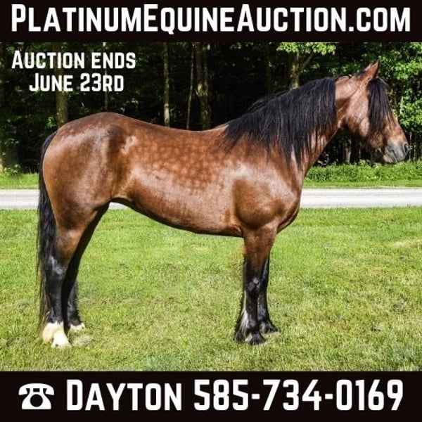 ONLINE AUCTION Place your bids at www.PlatinumEquineAuction.com Starting Bid $3500 Auction ends June 23rd, 2024 Need a new saddle? Check out White Rock Saddles on our website or Facebook! Who doesn’t love a pretty bay with a long mane and feathering? Mercedes is a stout 7-year-old Gypsy/Friesian cross mare standing at 14.2hh and is as pretty as one can be. Mercedes has a strong and steady walk that allows her to keep up with larger horses, and she is comfortable around other farm animals and traffic. Tarps, bridges, and water, don’t bother her, making her a versatile and reliable partner on the trail. Mercedes has ponied other horses, both on the trail and in the arena. While she can walk, trot, and canter in the arena, her true talent shines when she is out on the trail or working on the ranch. Mercedes sells 100% sound with no vices! Contact Dayton at 585-734-0169 for more information! Located in Warsaw, NY. ONLINE AUCTION Place your bids at www.PlatinumEquineAuction.com Starting Bid $3500 Auction ends June 23rd, 2024 Need a new saddle? Check out White Rock Saddles on our website or Facebook!