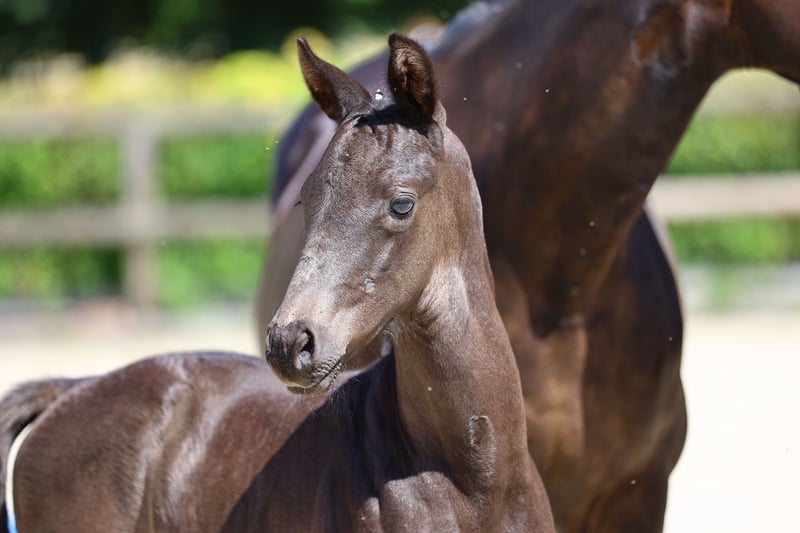 Der mit Spannung erwartete erste Jahrgang des Prämienhengstes Belun ist hier vertreten durch diesen lackschwarzen Strahlemann. Er beeindruckt uns durch seinen klassischen Trakehner Typ und durch sein souveränes Auftreten. Gute Mechanik im Trab, eine raumgreifende Galoppade und ein taktsicherer Schritt zeichnen dieses Fohlen aus. Aufgrund der Abstammung ein Anwärter für den Vielseitigkeitssport. Belun war Prämienhengst, bester Halbluthengst und bester Springhengst der Körung 2022. Er stammt aus einem Züchterhaus dessen sportlichen Ziele auf den Parcours und die Vielseitigkeit ausgerichtet sind. Sein Vater Nathan de la Tour errang Siege und Plazierungen in internationalen Springkonkurenzen bis 1.40 m und genießt in der französischen Springpferdezucht einen hervorragenden Ruf. Die Mutter brachte mit Bel Greco und Bel Avion zwei erfolgreiche Teilnehmer des Trakehner Freispringcups. Sie führt das wertvolle Blut des Springpferdevererbers Carajan. Zur nahen Verwandschaft zählt auch der S erfolgreiche Bel Espace Go. Das Pedigree der Mutter Urlina ist Spitzenklasse hinsichtlich vielseitiger Veranlagung. Sie ist eine der wenigen Töchter des Vollblüters Betel der sich als ein auf höchster Ebene international erfolgreiches Springpferd und als Vater erfolgreicher Vielseitigkeitspferde einen Namen gemacht hat. Sapros, Opal und der Vollblutaraber Galib ben Afas im fallenden Mutterstamm runden das Leistungspedigree dieses Fohlens positiv ab.