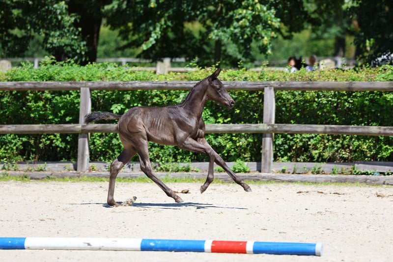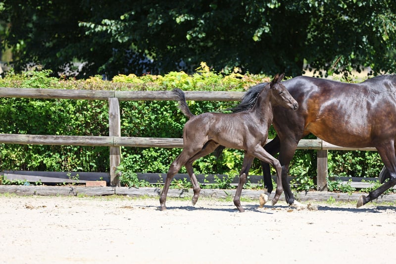 The eagerly awaited first crop of the premium stallion Belun is represented here by this jet black stallion. He impresses us with his classic Trakehner type and his confident appearance. Good mechanics in trot, an expansive canter and a sure-footed walk characterize this foal. Due to his pedigree, he is a candidate for eventing. Belun was premium stallion, best half-blood stallion and best show jumping stallion at the 2022 licensing. He comes from a breeder whose sporting goals are geared towards show jumping and eventing. His sire Nathan de la Tour achieved victories and placings in international show jumping competitions up to 1.40 m and enjoys a good reputation in the French show jumper breeding and enjoys an excellent reputation. The dam produced two successful participants in the Trakehner Free Jumping Cup, Bel Greco and Bel Avion. She carries the valuable blood of the show jumper sire Carajan. The successful advanced (S) level Bel Espace Go is also a close relative. The pedigree of her dam Urlina is top class in terms of her versatile disposition. She is one of the few daughters of the thoroughbred Betel, who has made a name for himself as an internationally successful show jumper at the highest level and as the sire of successful eventing horses. Sapros, Opal and the thoroughbred Arabian Galib ben Afas in the falling dam line positively round off the performance pedigree of this foal.