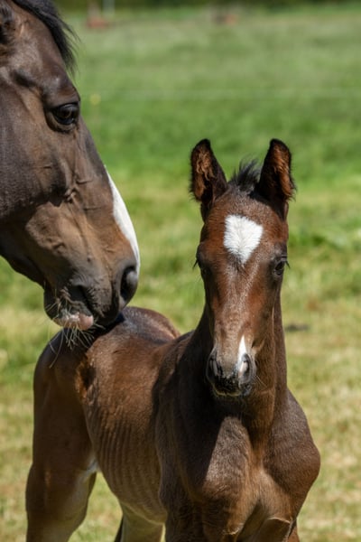 Dieses schöne Hengstfohlen, geboren am 12. Mai, wurde auf der Körung mit Prämie ausgezeichnet und für die Fohlenmeisterschaft West in Deutschland eingeladen mit folgenden Punkten: 8 – 7.5 – 7.5 / 8 – 7.5 – 8 / 7.5 = 54. Die Mutter H'indy (v. Hirtentanz) ist Elite und hat M Eventing und PSG Dressur geritten. (Siehe aktuellen Artikel auf Facebook Trakehner Rheinland). Der Vater ist der bekannte Elitehengst Millennium. Beide Großväter sind ebenfalls Elite und 4 von 8 Vorfahren sind das auch. Wie auf der Körung gesagt wurde: „eine seltene elitäre Abstammung dieses schönen Fohlens mit zusätzlichem Bewegungsvermögen. Die Kombination all dieser Gene hat ein sehr sportliches, gutes Fohlen hervorgebracht. Ein ansprechendes Fohlen mit guten Verbindungen, das gerne und gut bewegt. Ein guter, raumgreifender Schritt und ein schöner, untergesprungener Galopp mit stolzer Ausstrahlung und einem korrekten Fundament.“ Die Hengste Millennium, Easy Game und Gribaldi bedürfen keiner zusätzlichen Erläuterung bezüglich ihrer sportlichen Leistungen, aber auch in der Mutterlinie steckt viel Sport, neben der Mutter auch verschiedene Pferde im Subtop: (siehe https://www.horsetelex.nl/horses/pedigree/2687995/havanarivo). Das Fohlen ist gut erzogen und hat einen ruhigen, intelligenten und kooperativen Charakter. Regelmäßig entwurmt und vom Schmied begutachtet, der übrigens nichts tun musste aufgrund des korrekten Fundaments und der Härte der Hufe. Das Fohlen hat einen zusätzlichen Takt im Trab und wird bald ein dunkles Fell bekommen, das so charakteristisch für Millennium-Abstammungen ist. Das Fohlen kann nach dem Absetzen eventuell vor Ort in die Aufzucht bleiben.
