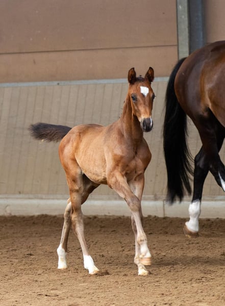 Este hermoso potro de semental nacido el 12 de mayo ha sido declarado digno de premio en la inspección y ha sido invitado al Campeonato de Potros del Oeste en Alemania, con las siguientes puntuaciones: 8 – 7.5 – 7.5 / 8 – 7.5 – 8 / 7.5, sumando un total de 54 puntos. La madre, H'indy (hija de Hirtentanz), es una yegua de élite y ha competido en eventos de M en salto y en doma PSG. (Ver artículo reciente en Facebook de Trakehner Rheinland). El padre es el reconocido semental de élite Millennium. Ambos abuelos también son de élite, y cuatro de los ocho antepasados anteriores también lo son. Como se mencionó en la inspección: “una descendencia de élite muy rara en este hermoso potro, con movimiento adicional. La combinación de todos estos genes ha dado lugar a un potro con gran carácter deportivo. Un potro llamativo con buenas conexiones, que se mueve con gusto y facilidad. Tiene un paso amplio y una bonita galopada con una expresión orgullosa y una estructura correcta.” Los sementales Millennium, Easy Game y Gribaldi no necesitan presentación en cuanto a sus logros deportivos, pero también en la línea materna hay mucho deporte, con varios caballos en la subtop además de la madre: (ver https://www.horsetelex.nl/horses/pedigree/2687995/havanarivo). El potro está bien criado y posee un carácter sobrio, inteligente y cooperativo. Ha sido desparasitizado regularmente y revisado por el herrador, quien no ha tenido que realizar ningún trabajo debido a la estructura correcta y la dureza de sus cascos. Tiene un trote adicional, muy tacto y, en el futuro, tendrá un pelaje oscuro, característico de los descendientes de Millennium. Después de la destete, el potro puede permanecer en la ubicación de cría si así se desea.