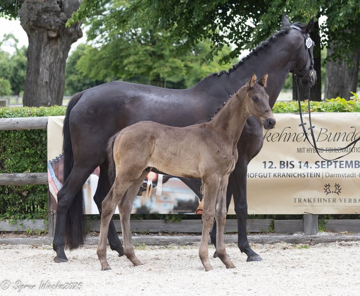 This well-built stallion impresses with three very good basic gaits and his uncomplicated nature. With a score of 56 points, he has qualified for the foal championship. He received a 9.0 for his canter! His friendly disposition and good basic gaits make him an ideal partner for ambitious riders looking for a talented young horse. The sire Hirtenstern impresses with remarkable rideability and is highly successful in young horse competitions. The dam Korrina carries rare performance blood with the necessary blood connection.