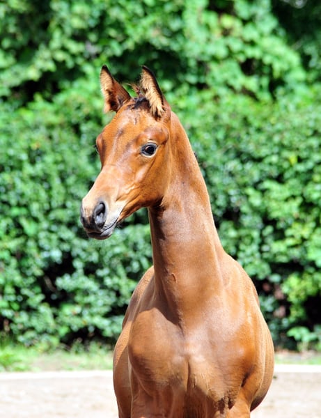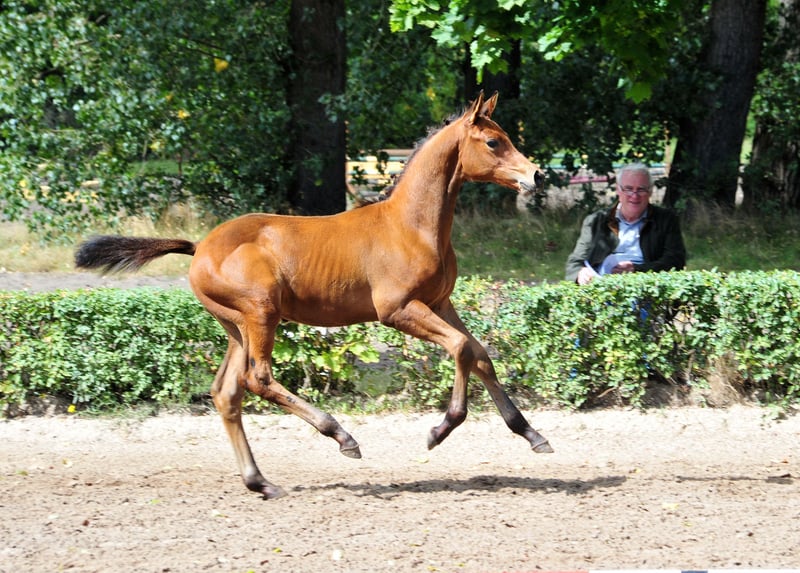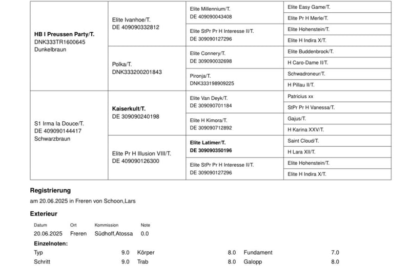 !AUFZUCHTPLATZ VORHANDEN! „Im Westen nichts Neues“ - ein strammer Bursche, der das Zeug für das höhere Studium besitzt. Mit 56,5 Punkten eingetragen, zeigt er sich mit viel Typ und Ausdruck als ein Bewegungskünstler für den Dressursport. Auch sein Vater Preussen Party begeistert durch unverkennbaren Typ, besondere Ausstrahlung, eine aktive Hinterhand und drei Grundgangarten der Extraklasse. 4- und 5-jährig gewinnt er das Trakehner Championat in Dänemark und beweist sich auch bereits als Vererber durch Fohlen mit Noblesse und hervorragender Bewegungsqualität. Seine Mutter, Irma la Douce, ist Tochter des unter Dorothee Schneider bis in die höchste Klasse intenational erfolgreichen Kaiserkult TSF (Siege und Platzierungen bis hin zur Deutschen Meisterschaft, Weltcup-Küren und Nationenpreise in München, La Mandria, Balve, Salzburg, Aachen etc.) Ihre Mutter ist die im Klosterhof Medingen geborene ESt Illusion von Latimer – Hohenstein. Die Mutter der Illusion ist die Vollschwester von Insterburg TSF Interesse. Interesse ist zugleich Mutter des Höremer Hengstes Ivanhoe. Ein Pedigree voller im Sport höchst erfolgreicher Pferde. Machen Sie sich selbst ein Bild und schauen Sie sich unseren "Westi" vor Ort an.