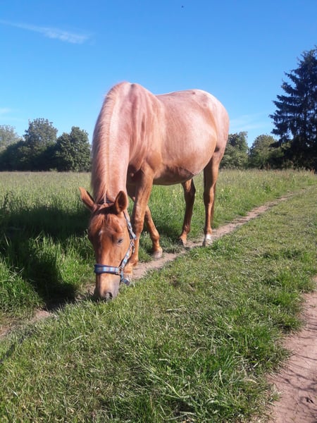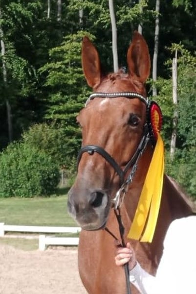 ...mit der 50 % Chance auf Sonderfarbe Roan (Farbwechsler). Warum Sperma - wenn es gleich ein fertiger Embryo sein kann?! Zum Verkauf steht ein Embryo aus der Trakehner Stute Bergkada und dem Vollblüter Leistungsvererber Il Divo xx. Die Stute Bergkada wurde auf der diesjährigen Bundestutenschau in Kranichstein mit dem 1e Preis bedacht. Neben ihrem hervorragenden Pedigree wurde besonders ihr Schritt hervorgehoben: "Jeder Schritt wie der andere, Runde um Runde." Auch im Rahmen ihrer Stuteneintragung konnte sie in den Grundgangarten überzeugen und wurde hier mit den Wertnoten 8, 8, 8 belohnt und auch im Gesamteindruck erhielt sie eine 8. Ihre Abstammung?! Absolut legendär. Namen wie Beg xx, Marduc, Habicht oder Trafaret auf der Hengstseite, sowie die unvergessene Hörsteiner Grande Dame Shynoon zieren ihr Pedigree. Ihre Sonderfarbe Red Roan oder Fuchstichelhaar verdankt sie dem Hengst Bukephalos, der auf den ebenfalls roanfarbenen Insterfeuer zurückgeht. Zur Zeit sind in Deutschland nur zwei Stuten mit diesem seltenen Farbgen zuchtaktiv für die Trakehner. Ein doppeltes Argument: Leistung trifft Farbe! Trotz (oder gerade wegen?) des Leistungsblutes zeigt sich diese Stute absolut unerschrocken und leistungsbereit. Ob Sankt-Martins-Umzug, Kindergeburtstag oder Helikopter-Einsatz auf der Nachbarwiese - dieses Pferd lässt sich durch nichts aus der Ruhe bringen! Das letzte Bild zeigt ihr Trakehner Fohlen aus 2019 von Phlox (Championatsfohlen), das jetzt 6 jährig keine Wünsche als verlässlicher Freizeitpartner offen lässt. Der Vater Il Divo xx, Sohn des Dashing Blade xx, war Reserve-Siegerhengst des „Schaufensters Vollblut“ 2010 in Münster-Handorf. Ein ungmein trockener und großrahmiger Hengst, mit bedeutenden Maßen, viel und korrektem Bein, langen Linien, in klarer Aufteilung seiner Körperpartien. Diese Anpaarung wurde bewusst auch wegen der Schönheit und Noblesse des Hengstes gewählt. Auch seine Exterieur-Points liegen in der Gesamtaufmachung mit komfortablem Schulter-Widerrist-Gürtel und langer, sehr gut angesetzter Halsung, die sich ideal geformt zum Genick hin verjüngt. Il Divo xx ist mit drei hervorragenden, taktsicheren, raumgreifenden und zugleich elastischen Grundgangarten ausstaffiert, die von viel Schulterfreiheit, Vorderbeinaktion gekennzeichnet, immer aus dem aktiven Hinterbein getragen werden. Er kam in drei Rennjahren 15-mal an den Start, davon dreimal siegreich und viermal platziert (GAG 92,5 kg). Eine traumhafte Anpaarung, aus der mehrere Embryonen gewonnen werden konnten. Diese liegen in der renommierten Pferdeklinik Mühlen (Vis á Vis zu Schockemöhle) sicher "auf Eis". Die Spezialisten der Pferdeklinik können die Vorbereitung der Empfängerstute, sowie die erfolgreiche Implantation vor Ort durchführen, Falls keine eigenen geeignete Empfängerstute vorhanden ist, so kann auch bei der Vermittlung geeigneter Empfängertiere seitens der Klinik Hilfestellung geleistet werden. Warum also die Unsicherheit der Besamung in Kauf nehmen - wenn gleich der fertige Embryo mit Traum-Pedigree wartet??!
