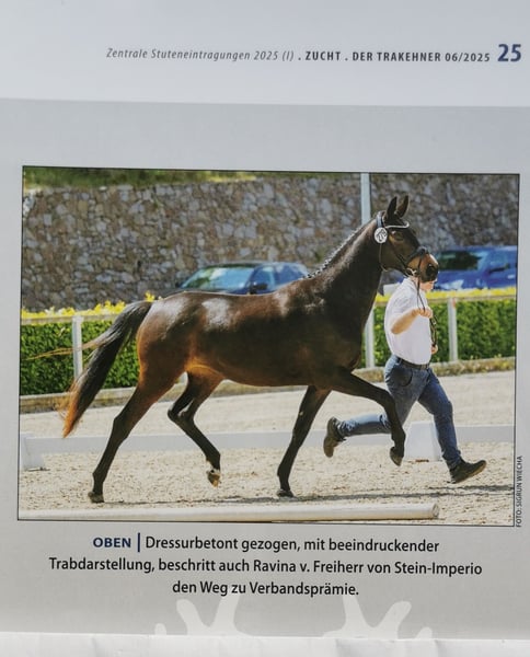 Una fattrice con molto charme, espressione, tipo e grande potenziale per lo sport e la riproduzione. Con la linea paterna di Freiher von Stein e il MV Imperio, questa bellissima fattrice unisce due linee elite orientate al dressage. Convince con un esteriore molto tipico e movimenti sempre molto buoni in tutte le andature fondamentali. Già premiata come puledra di pregio presso il Verband Pferdezucht Sachsen-Thüringen e.V., ha impressionato anche durante la sua valutazione con i punteggi 8 - 7,5 - 7,5 / 7,5 - 8 - 7 / 8, qualificandosi con un punteggio totale di 53,5 per il campionato delle fattrici del Verband Pferdezucht Sachsen-Thüringen e.V.