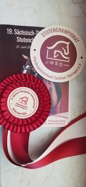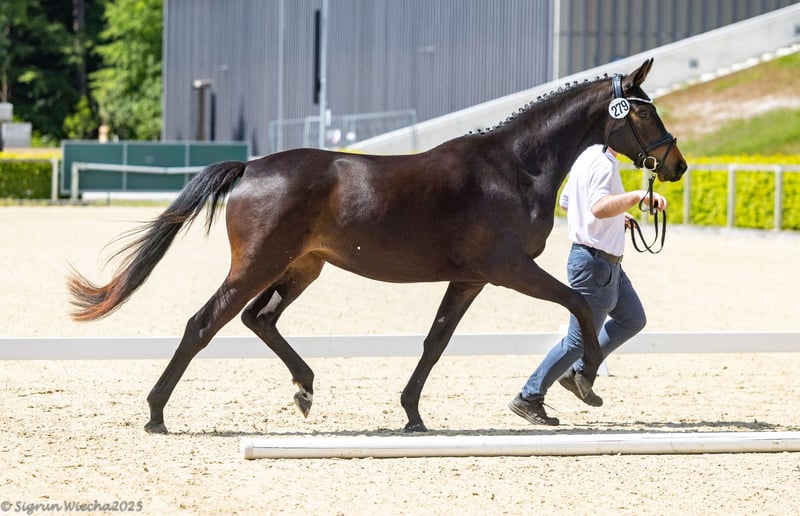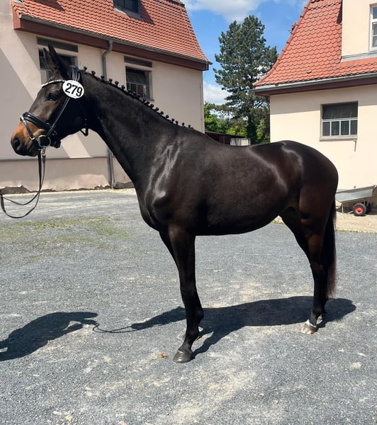 A mare with a lot of charm, expression, type, and great potential for sport and breeding. With her sire line going back to Freiher von Stein and her dam's sire Imperio, this beautiful mare combines two elite dressage-oriented lines. She impresses with a very typical exterior and consistently excellent movements in all basic gaits. Already awarded as a premium foal by the Pferdezuchtverband Sachsen-Thüringen e.V., she also impressed during her inspection with scores of 8 - 7.5 - 7.5 / 7.5 - 8 - 7 / 8, qualifying with an overall score of 53.5 for the mare championship of the Pferdezuchtverband Sachsen-Thüringen e.V.