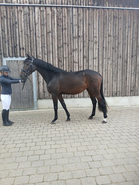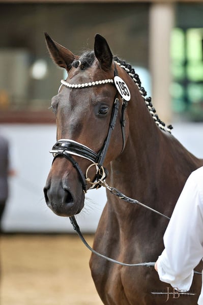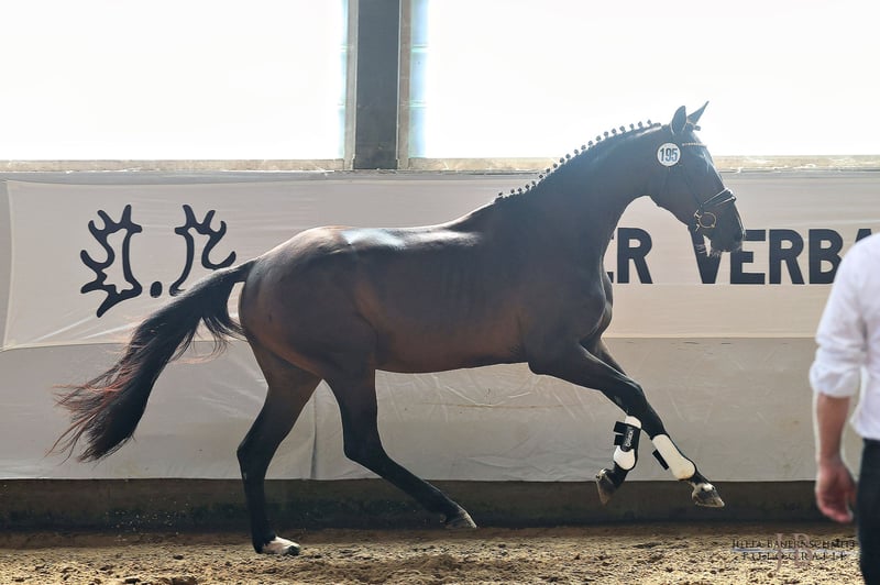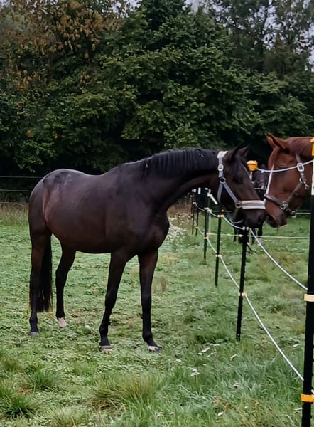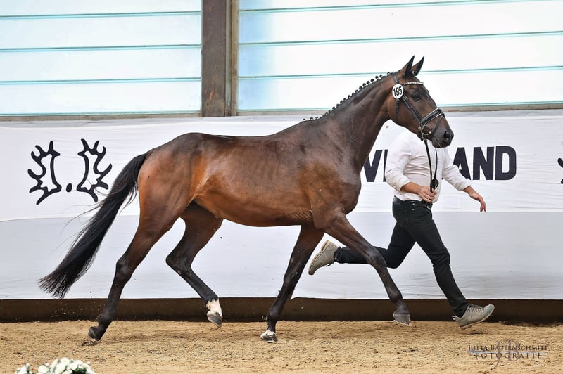 Herzblume ist eine sehr freundliche Stute aus erfahrenem Züchterhaus und ist ein einem anerkannten Aufzuchtsbetrieb auf der schwäbischen Alb aufgewachsen. Stets aufmerksam will sie alles richtig machen. Aktuell ist sie angeritten und kann in allen Gangarten in der Halle geritten werden. Als Fohlen gehörte sie zu den besten Stutfohlen Bayerns. Bei ihrer Eintragung in Marbach 2025 erhielt sie die Prämienanwärterschaft. Bei korrektem Fundament und harmonischem Körper im mittlerem Rahmen bewegt sich die Stute stehts mit der Hinterhand unter den Körper. Mit natürlicher Selbsthaltung bietet sie mit leichtem Genick willig die Anlehnung an die Hand an. Eine Entwicklung bis zur schweren Klasse in der Dressur ist auf Grund ihrer Harmonie denkbar. Auch beim Freispringen zeigt sie gute Momente. Durch die Linienzucht auf die Stutenlinien der Tatjana und der Herbstgold sowie der Anbindung auf die hochaktuelle Trude-Familie ist sie auch züchterisch interessant. Da mein Stall voll ist, biete ich sie unter Wert an, um wieder weiter decken zu können.