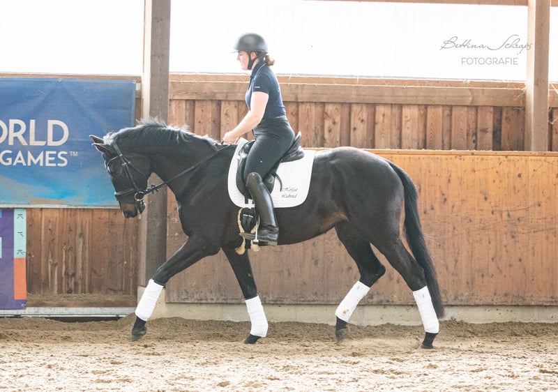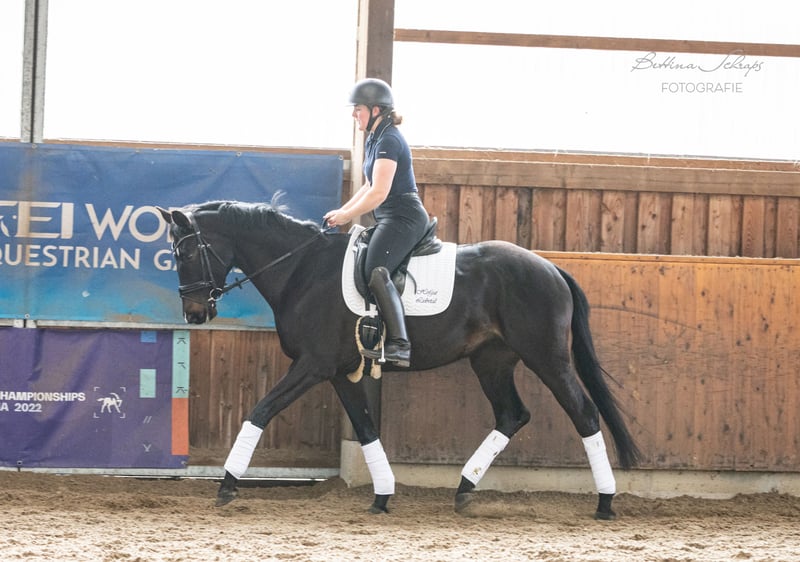 Urania was backed as a four-year-old and then given time to mature. She has been ridden consistently for the past quarter of a year and is very cooperative, making daily progress. In addition to dressage work, she is also ridden in the field and has already begun jumping over colorful poles and small cross-country obstacles. Her sire, the elite stallion candidate Ganderas, was already placed in S-Dressage at the age of seven. The YouTube video shows him competing in an S-Dressage test. Her dam was awarded premium mare status by the Trakehner Verband and was the winner of her mare performance test. Her pedigree also includes the renowned S-Dressage stallions E. H. Hofrat on the sire’s side and E. H. Easy Game on the dam’s side, both tracing back twice to the legendary E. H. Gribaldi. Urania is an absolute sweetheart in handling and shows no bad habits. She is familiar with pasture, open stall, and box, and has been lunged on the lunge line. In summer, she shows minor signs of eczema, which are perfectly managed with a fly sheet during turnout. We are looking for a family with experience in young horse training for our very people-oriented Urania. Due to her age and training level, she is definitely not suitable for beginners, although she is incredibly sweet. She is being sold on behalf of the breeder. X-ray images are available and can be sent upon request.