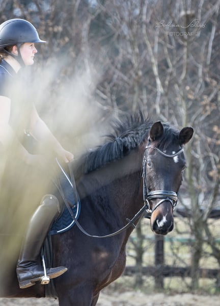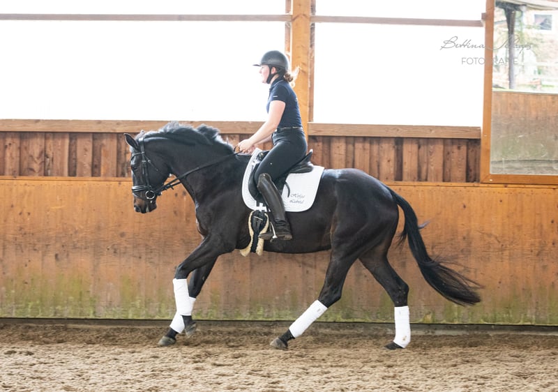 Urania została rozpoczęta w treningu w wieku czterech lat, a następnie miała jeszcze czas na dojrzewanie. Od kwartału ponownie jeździmy na niej regularnie, jest absolutnie współpracująca i każdego dnia robi postępy. Oprócz pracy w ujeżdżeniu, pracujemy z nią również w terenie, a już wykonuje pierwsze skoki przez kolorowe tyczki i mniejsze przeszkody terenowe. Jej ojciec, kandydat na konia elitarnego Ganderas, był już siódmego roku życia plasowany w konkursach S-Dressage. Film na YouTube pokazuje go w konkursie S. Jej matka była nagrodzoną klacz Trakehnera i zwyciężczynią swojej testu wytrzymałościowego dla klaczy. Ponadto jej rodowód sięga dwukrotnie do niezapomnianego E. H. Gribaldi, zarówno po stronie ojca (E. H. Hofrat), jak i matki (E. H. Easy Game). W obsłudze Urania jest prawdziwym skarbem i nie wykazuje żadnych niepożądanych zachowań. Zna pastwisko, wolną stajnię, boks oraz lonżę. Latem wykazuje niewielkie objawy ekzemu, które skutecznie kontrolujemy za pomocą derki na wybiegu. Poszukujemy dla naszej bardzo przyjaznej ludziom Uranii rodziny z doświadczeniem w szkoleniu młodych koni. Ze względu na jej wiek i poziom wytrenowania, nie jest to koń dla początkujących jeźdźców, mimo że jest naprawdę bardzo łagodna. Sprzedajemy ją na zlecenie hodowcy. Dostępne są zdjęcia rentgenowskie, które w razie potrzeby wyślemy.