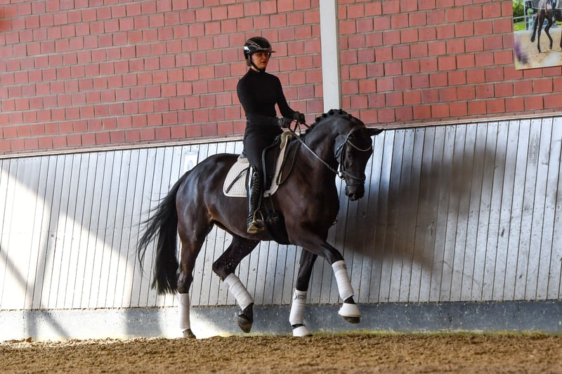 This very impressive black mare with a refined frame and presence also fills the large arena. Her conformation is exceptionally well-built, standing on a solid foundation. Despite being well and long matured, she still has plenty of development ahead of her. She is straightforward to ride and comes from a pedigree of the highest caliber: full sister to the champion stallion Kaiser’s Erbe, three-quarters sister to the champion stallion Kaiser Milton, and full sister to his licensed full brother Kavalli. She is also a half-sister on the sire’s side to TSF Dalera BB and Millennium. Her dam, Kaiser’s Els, is a full sister to the licensed Grand Prix brothers Kaiserkult and Kaiserdom, as well as their full brother Kaiseradler, who remains successful at Grand Prix level even in advanced age. These references are truly hard to beat.