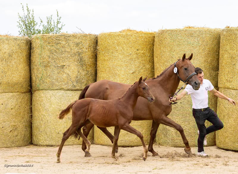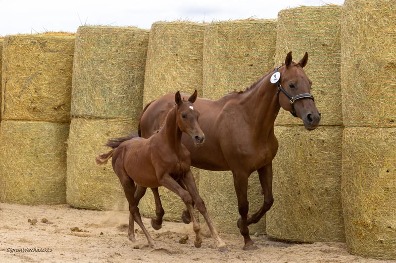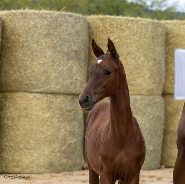 REZZI wird auf der Sweetwater Stud Autumn Sale 2025 angeboten. Die Auktion läuft vom 12.11. bis 19.11.2025. Bid Up startet um 19:00 Uhr MEZ. Registrieren und mitbieten können Sie sich unter https://auction.sweetwater-stud.com/auctions Dalton Vra AA hat mit seinem ersten Jahrgang bei uns Akzente gesetzt! Er verbesserte jede einzelne Beurteilungsposition, und die Gesamtpunktzahl um ganze 3 Punkte! Ein leistungsgeprüfter Anglo-Araber, der in Dänemark sowohl in Dressur wie auch Springen Erfolge bis zur Kl. M vorweisen kann. Vater von Dalton Vra AA ist der Shagya-Araber Dartan. Diese Hengstlinie geht zurück auf den Araberhengst DAHOMAN, geboren 1846. Die Dahoman-Linie zeichnet sich durch einen starken Rahmen, hervorragende Knochen, Zähigkeit und Ausdauer aus. Seine Mutter Donna Vra AA ist eine Tochter des im Springsport hocherfolgreiche DON-CASTER AA von DORPAS AA, intl. Springen bis Klasse S** mit Dirk Schröder (u.a. 1.Platz CSI Neustadt/Dosse). DON-CASTER AA ist auch Vater von JUMEAUX RH AA (Springen in VS bis Kl. M2*) und ein mütterlicher Halbbruder zu BONAPARTE N AA, NABUCCO AA. Seine Grossmutter Piroutte Vra AA stammt von PRIMUS AA, ein Sohn des berühmten MATCHO AA (NK-LGS 578.029,-- €), dessen Nachkommen vielmals in Dressuren hocherfolgreich waren. Er ist Vater von 37 S-Dressurpferde, 8 S-Springpferde, 1 S-VS-Pferd und 7 S-Fahrpferden, hauptsächlich Hannoveraner. Dieses Prämienstutfohlen (56 Punkte) ist eine äußerst typvolle Tochter dieses aus Dänemark importierten, leistungsgeprüften und in Springen und Dressur sporterfolgreichen, doppelt veranlagten Anglo-Arabers. Rezzi punktet nicht nur im Typ, sondern auch mit Korrektheit und drei gleichmäßig sehr guten Grundgangarten. Die Mutter Rendez-vous One v. E.H. Dramatiker ist als Prämienanwärterin mit 54,5 Punkten ins Stutbuch eingetragen. Muttervater E.H. Dramatiker ist u.a. Vater der gekörten Hengste GLÜCKSRUF I und II und der Vollbrüder KARLSSON I und II, HEIDEKRUG oder des Mecklenburgers DO IT oder der Pr.St. THALIJA, der Mutter des Hengstes TIME SQUARE. Grossmutter Russian Princess xx ist eine Tochter des GROOM DANCER xx-Sohnes LORD OF MEN xx, sie legte ihre Leistungsprüfung auf der Rennbahn ab. Lord of Men xx, der in Frankreich im Haras du Logis wirkte, kann eine NK-LGS von 5,36 Mio. $ aufweisen, wobei darunter auch einige sehr erfolgreiche Hindernispferde sind. Die nächste Mutter, Russian Rumba xx von Alkalde xx, der ebenfalls Nachkommen in der Vielseitigkeit hat bzw. der als Muttervater erfolgreicher Vielseitigkeitspferde zu finden ist. Ihre Halbschwester, RUSSIAN SAMBA xx, ist wiederum Mutter des im Gestüt Idee aufgestellten Hengstes RUSSIAN TANGO xx. Erwähnt sei hier noch, dass dieser Zweig auf die vererbungsstarke SURUMU xx-Tochter Russland xx zurück geht. SURUMU xx ist Lieferant einiger Söhne, wie die Doppelvererber BANDOLIERO xx, ELSURIMO xx, LOKATOR xx, OCAMONTE xx, RIVERO xx, TEMPELTANZ xx und dessen Sohn OSTERMOND xx. Allesamt Väter von Nachkommen, die vor allem im Springen und in der Vielseitigkeit erfolgreich waren, aber auch Nachkommen im grossen Viereck hatten, wie z.B. die Trakehner LOKATOR xx-Tochter LU-LU. Sportlich und auch züchterisch setzt dieses Stutfohlen besondere Akzente, nicht zuletzt durch ihr absolutes Outcross-Pedigree. Stutenfamilie/mare line: E1 Tregonwell's Natural Barb Mare https://auction.sweetwater-stud.com/auctions