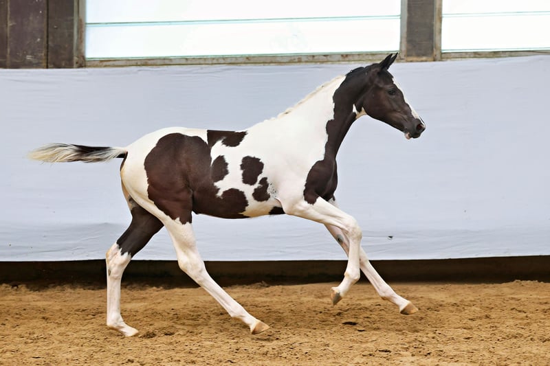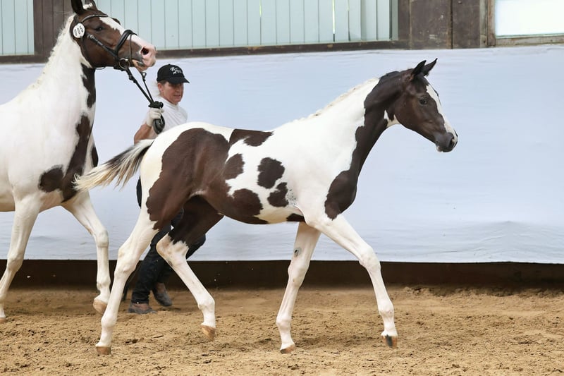 Auch auf dem Fohlenchampionat von Baden-Württemberg in Marbach bildete Rotherzchen RW ein ganz besonderes Highlight: Hochedel und weiblich, dazu sehr vornehm setzte sie sich in Szene, immer im Gleichgewicht, mit Takt und in akzentuiertem Bewegungsfluss war sie richtiger Augenfang! Dazu vermittelt sie in ihrer wunderbaren Rappscheckfarbe, selbstverständlich gleichmäßig und schönlinig gezeichnet, Ästhetik und Attraktivität gleichermaßen. Auch züchterisch ist Rotherzchen RW etwas ganz Besonderes: Ihr Vater Giuliani, Prämienhengst der Körung und Trakehner Dressurchampion, sammelt aktuelle bewundernswerte Erfolge auf der Bühne der S-Dressur. Die züchterisch hochbewährte Mutter zählt zu den wenigen Töchtern des springgenialen Sheridan, führt von daher das Erbe der Vererberlegende Gluosnis xx und brachte mit ihrer Tochter Rotkehlchen RW v. Grenoble die hochdekorierte Reservesiegern der Zentralen Stuteneintragung Baden-Württemberg 2025. Rotherzchen RW kommt aus behüteter Zucht und Aufzucht, wo ihre mütterliche Familie bereits seit Generationen gepflegt wird, begeistert durch ihr aufgewecktes und menschenfreundliches Temperament und macht einfach nur Freude!