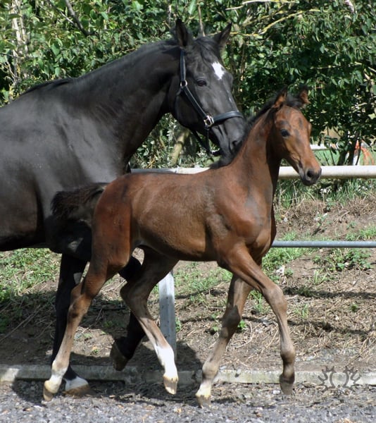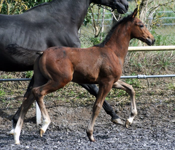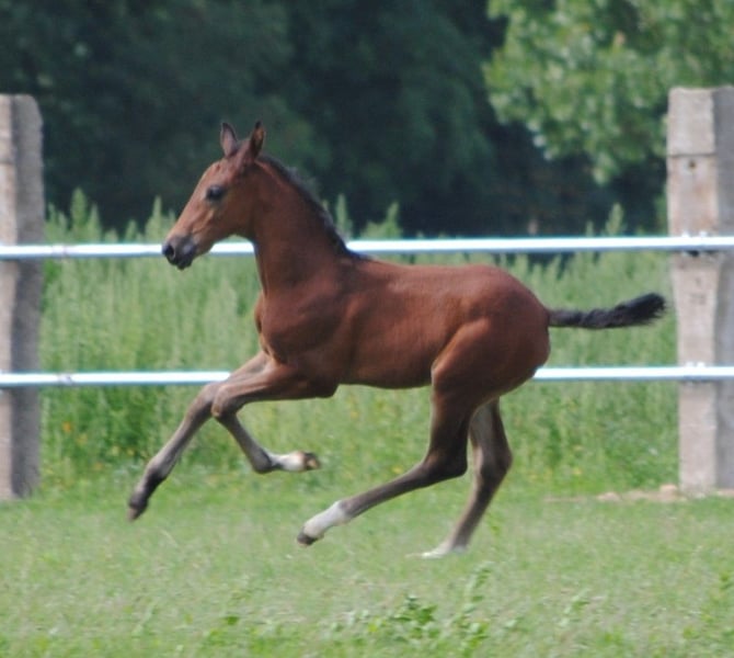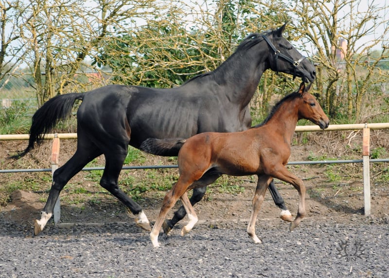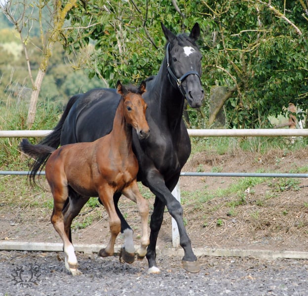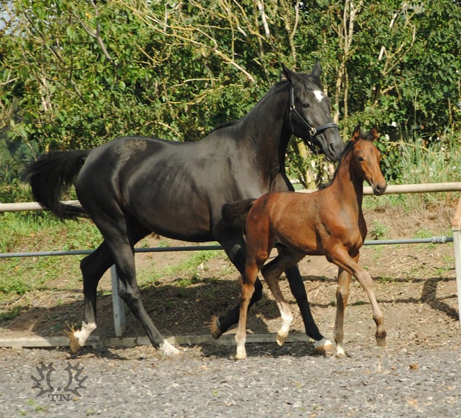 Larius zeigte sich von Beginn an sehr vital, langbeinig, kruppenbetont und mit gutem Halsaufsatz und Grundgangarten. Larius TN, geboren am 12. Juli 2023, ist trotz des späteren Geburtsdatums ein gutentwickelter Sohn unseres Halbbluthengstes Le Chevalier TN (v. Cavallerie xx), der Nurmi- und Hengstleistungsprüfungssieger war. Die Mutter des typvollen Dunkelbraunen ist die Prämienstute Lara TN v. Elkadi II. Sie ist die Halbschwester des auf internationalen Militaryturnieren gestarteten Wallachs Traumprinz, ebenfalls aus unserer Zucht. Unseres Erachtens nach wird Larius Zukunft auch in diesem Bereich spielen. Der schön aufgesetzte Hals und die lange schräge Kruppe, vor allem aber seine auffällige Galoppade prädestinieren ihn für diesen Sport.