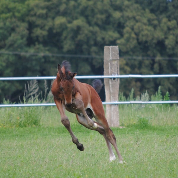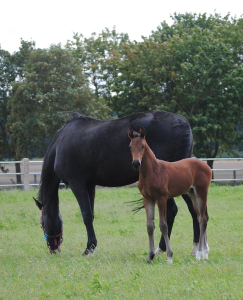In the morning hours of July 12th, our Elkadi II daughter Lara TN ended this year's foaling season with her bay colt by Le Chevalier TN. The little stallion was born almost 14 days prematurely, but this could not stop him from heading for the milk source in a hurry. Larius TN is already her third foal and it will be exciting at this year's foal show because her first foal, La Perfekta TN by Perfekt, will also be registered by the ZSAA. She leads a filly of the Majenfeld heartbreaker by foot.