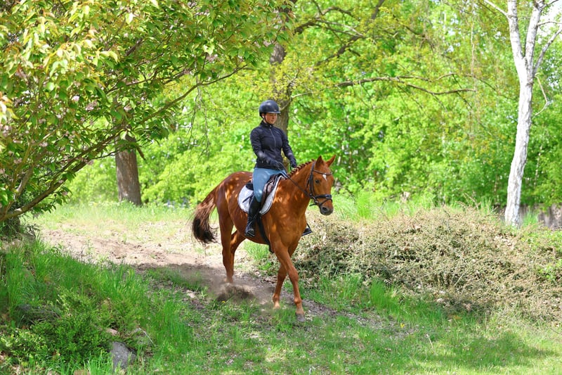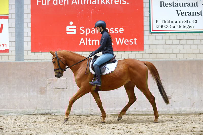 Noch sehr jugendlich im Auftreten, was natürlich seinen erst 3 Lebensjahren zu verdanken ist, weiß Maientanz trotzdem bereits eine gewisse Routine unter dem Sattel auszustrahlen. Vor ca. einem Monat angeritten, absolviert er die ihm gestellten Aufgaben im Schritt, Trab und Galopp mit Übersicht und einem sehr anständigen Wesen und man erkennt, dass Anlehnung und Balance bei weiterer, klassischer Ausbildung, sehr schnell an Ausgeprägtheit gewinnen werden. Auch im Gelände neugierig, aber unkompliziert, sodass über eine zukünftige Vielseitigkeitskarriere ebenfalls nachgedacht werden kann. Mit E.A. Blanc Pain und Uckermäcker zwei solide Reitpferde-Macher in den ersten Generationen, die die gewünschte Bedienbarkeit versprechen.