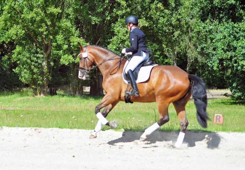 Der großrahmige Tom Taylor ist ein ganz bedeutend aufgemachtes Pferd mit erstklassigem Interieur und drei richtig guten Grundgangarten. Der Schritt ist imposant. Im Trab und Galopp sehr taktsicher, schwung- und kraftvoll! Aktuell : siegreich in Dressurpferdeprüfung - erfolgreich in Reitpferdeprüfungen! Er ist altersgemäß auf dem Weg in Richtung Kl. L. Wir wünschen uns für ihn einen gefühlvollen Reiter, der ihn dressurmäßig weiter fördert. Er ist ein Kandidat für das große Viereck! Tom Taylor liebt auch Ausritte und hat auch viel Freude am Freispringen! Er ist sehr Gruppen verträglich und insgesamt sehr freundlich zu Mensch und Pferd. Vater Zauberdeyk ist aktuell bis Grand Prix erfolgreich. Seine Mutter gewann ihre Stutenleistungsprüfung und brachte mit der 4jährigen Taluna eine Siegerin in Reitpferdeprüfung sowie Dressurpferde A erfolgreiche Tochter. Aus naher Verwandtschaft der M/S erfolgreichen Dressurpferde Thimur (Grand Prix), Taylord, Tausendsassa, Trocadero, Trezèguét, Tolkien ...