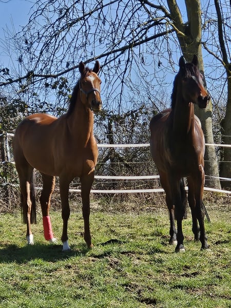 Ich suche Unterstützung bei meinen zwei Pferden Krümel (Trakehner/8 Jahre/Ausbildungsstand Dressur/Springen/Gelände A/L) und Escalate xx (Vollblut/6 Jahre/in der Umschulung zum vielseitigen Reitpferd). Die beiden stehen in Pulheim/Ingendorf auf einer charmanten Reitanlage mit kleiner Reithalle, Longierhalle, Außenplatz und Ausreitmöglichkeiten direkt ab Hof. Im Umgang sind die beiden zuckersüß und einfach nur lieb, insbesondere Escalate auch für Anfänger geeignet, wenn nur eine Pflegebeteiligung gesucht wird. Beim Reiten sind die beiden schon aufgrund ihres Alters keine Anfängerpferde. Es steckt schon Power in den beiden und sie können auch schon einmal einen Buckler machen oder wegspringen, wenn sie munter sind. Krümel wurde bisher vielseitig ausgebildet, hat aber jetzt den Fokus auf der Dressur. Wir wollen den Spung in die Klasse M schaffen. Escalate ist aufgrund ihrer Rennbahnvergangenheit noch in der Umschulung, wird aber auch schon gesprungen und wird in ein paar Woche an ihrem ersten Geländetraining teilnehmen. Ob nur "Tüddeln" oder auch Reiten ggf. mit Turnierambitionen ist eine Frage der Absprache und des Könnens. -Für das Reiten ist eine "weiche Hand" und ein von der Hand unabhängiger Sitz Voraussetzung. Beide sind keine Gewichtsträger. Die Möglichkeit der Teilnahme an hochqualifiziertem Unterricht in Dressur und Springen besteht. Als Arbeiten würden das Abäppeln und das Auffüllen der Heuboxen des sehr gepflegten Offenstalls von den beiden Anfallen (Zeitaufwand ca. 30 Minunten). Wer sich also angesprochen fühlt und mit meinen Pferden gemeinsame Zeit genießen möchte kann sich gerne bei mir melden.