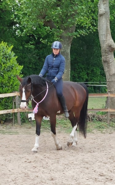 Voor de juiste plek prijs licht bespreekbaar! We zien hem graag vertrekken naar de juiste plek. Unieke kans voor de juiste ruiter met gevoel en een wat kleiner budget. Na lang wikken en wegen toch besloten om deze prachtige en lieve ruin te koop te zetten. Het is een ontzettende lieve ruin, super makkelijk en simpel in de omgang. Sociaal naar mens en dier. Echt een knuffel en clown. Met een goede stamboom. Het is een paard dat nog erg jeugdig is. Met een bijzonder mooie uitstraling. Hij is zadelmak en licht doorgereden, beheerst alle drie de basis gangen, stap, draf, galop en enkele pasjes wijken. Maar moet nog wel verder doorgereden worden. Het is een werkwillig paard dat van uitdaging en afwisseling houdt. Onder het zadel heeft hij een ruiter nodig die hem vertrouwen kan geven en hem in zijn onzekerheid kan ondersteunen. Regelmatig op bosrit geweest zowel alleen als met meerdere en is verkeersmak. Ook heeft hij al eens een sprongetje gemaakt, en doet dit ook braaf. Daar de basis er eerst goed in moet zitten hebben wij dat niet verder getraind. Voor wie: Liefst ruiter die ervaring heeft met het doorrijden van jonge paarden. Hij heeft iemand nodig die consequent en duidelijk is in de hulpen en daardoor nog niet geschikt voor beginners of onzekere ruiters. Karakter en omgang: In omgang een braaf en makkelijk paard. Met een eerlijk en nuchter karakter. En maakt je altijd aan het lachen. Staat in de zomer 24/7 buiten op de wei in gemengde kudde, van 1 oktober tot april/mei s’ nachts op stal. Staat rustig op de poetsplaats. Bijzonderheden: Deze ruin is licht kramperig. Tijdens het rijden zie of merk je hier niets van. Achterwaarts is geen probleem voor hem. Hij is braaf bij de hoefsmid. Onderhoud: Altijd netjes bekapt, ontwormt, geënt, tandarts en Fysio. Alle Keuringen toegestaan K.K.