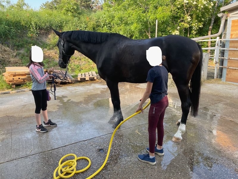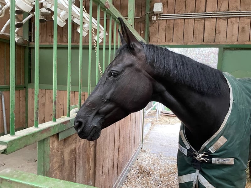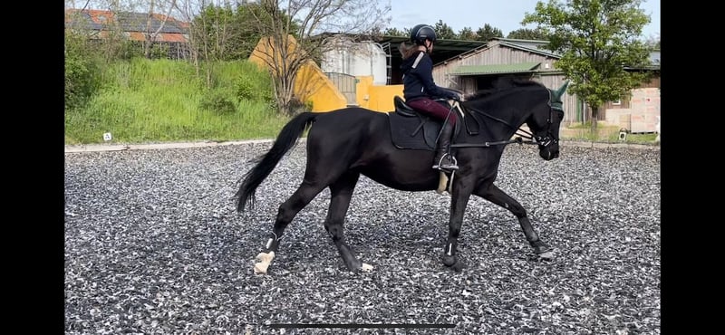 Aus Zeitmangel steht eine liebe und vielseitig veranlagte 9-jährige Rappstute für ambitionierte Freizeitreiter zum Verkauf. Sie macht regelmäßig Dressurarbeit, Sprunggymnastik und Bodenarbeit und geht brav ins Gelände (allein oder in der Gruppe). Sie hat schöne Grundgangarten und zeigt sich sehr geschickt am Sprung. Sie ist gut erzogen, brav und unkompliziert im Umgang und sehr verträglich mit anderen Pferden. Verlade- und schmiedefromm. Bei ernsthaftem Interesse stehe ich gern für weitere Informationen zur Verfügung. Probereiten nach vorheriger Absprache möglich.