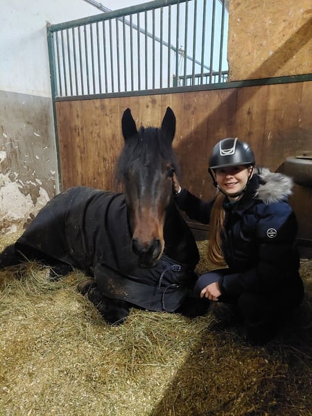 Nous vendons notre hongre de 5 ans, mesurant un peu plus de 1,60 m (cheval de sport hongrois), qui est monté par ma fille (15 ans) depuis presque un an. En dressage, il est à un bon niveau A, et il participe très motivé à l'entraînement de saut d'obstacles. L'entraînement au saut a commencé il y a deux mois, et il saute actuellement environ 80 cm. Lors des sorties en groupe, il se montre détendu et n'est pas effrayé. En main, il se comporte de manière équilibrée et reste calmement au box de pansage, cependant, en raison de son âge, il n'est pas adapté aux cavaliers totalement débutants. Chez le maréchal-ferrant, il se montre très sage. Il connaît le box ouvert et le box avec sortie au paddock, et il a toujours été compatible avec d'autres chevaux jusqu'à présent. Un examen vétérinaire avec des radiographies (sans constat) de l'année dernière est disponible. Pour plus d'informations et des vidéos, n'hésitez pas à demander. Pour l'essai, un montant de 20 EUR est à régler, qui sera déduit du prix d'achat en cas d'achat.