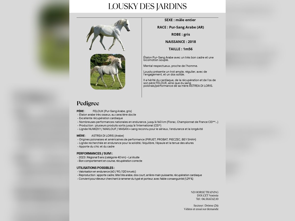 ✨ Lousky des Jardins✨ is available! An elegant and promising horse, ideal for pursuing a career in endurance racing or for breeding. Location: Drôme (26) Strengths: Gait: light, supple, very comfortable Conformation: harmonious, strong frame, ‘green’ horse in work (potential to be moulded) Exceptional origins: Sire: FELOUK (Maklouf / Masan) – approx. 50 offspring with performances up to high level (CEI*)** Dam: Astrea di Loris (ITA) – PIRUET origins Qualification: 40 km validated Who is he for? Riders looking for a well-bred horse to develop for sport or an interesting profile for a breeding programme (pedigree, model and locomotion all present). Price: on reasonable offer 📸 Additional photos & videos on request (PM). 👉 Contact me via private message for more information, videos and trial arrangements. Translated with DeepL.com (free version)