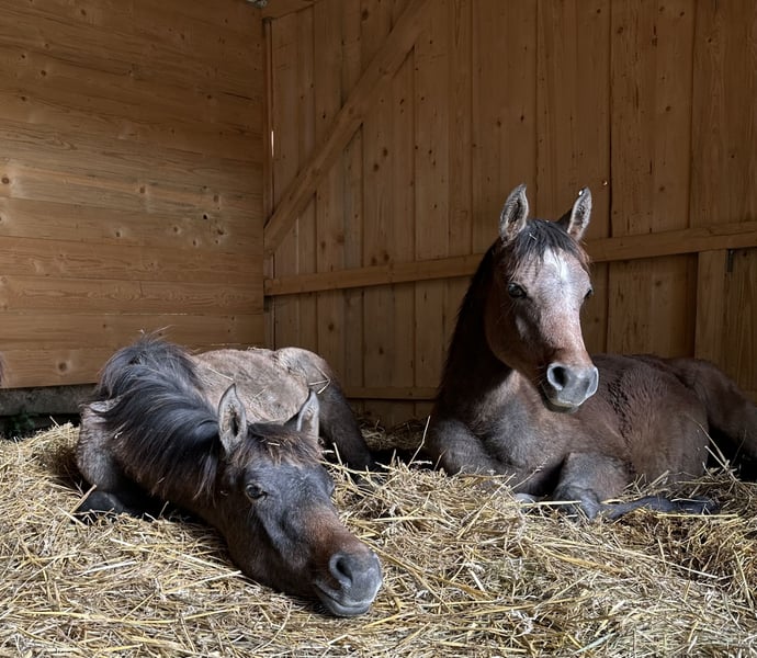 BH Macan von A Magic Man of Kossack ist ein russisch gezogener Vollblutaraberhengst, der 2025 vom VZAP mit der Fohlenprämie ausgezeichnet wurde. Er überzeugte bei unserem Hoftermin die Vertreterinnen des Zuchtverbandes durch seine Präsenz und seinen Charme. Macan ist ein Hengstfohlen mit sehr viel Ausstrahlung und toller Aufrichtung, er liebt es, sich zu präsentieren. Er besticht durch sein solides Fundament und schwungvolle, raumgreifende und sehr taktreine Bewegungen. Jetzt schon zeichnet sich ab, dass Macan sowohl vom Wesen als auch von seinen qualitativen Merkmalen ein vielseitig einsetzbarer Partner unter dem Sattel sein wird. Macan wird Schimmel und hat jetzt schon ein feines braun-silbergraues Fell. Macan ist dem Menschen zugewandt, sehr gelehrig und umgänglich. Der junge Vollblutaraber-Hengst ist halfterführig, kennt es angebunden zu sein, lässt sich überall anfassen, gibt die Hufe problemlos und ist sehr geduldig beim Schmied. Auch das regelmäßige Entwurmen ist selbstverständlich. Er hat den ersten Sommer mit den anderen Fohlen, drei Jährlingsstuten und unseren Mutterstuten auf den Wiesen auf dem Borner Hof verbracht. Wind, Regen, Sonne usw. sind für sie kein Problem. Auch Kinder, Fahrzeuge, LKWs, Traktoren, Hunde, Rehe und vieles mehr kennt er und stört sich daran nicht. Macan wächst auf dem Borner Hof robust und mit intensivem Familienanschluss auf. BH Macan wäre bereit, in ein neues Zuhause zu ziehen und seinem neuen Besitzer viel Freude zu bereiten. Er könnte auch zur weiteren Aufzucht bis 10/27 bei uns auf dem Borner Hof bleiben. Wenn BH Macan Ihr Interesse geweckt hat und Sie ihn gerne einmal kennenlernen möchten, würden wir uns über eine Nachricht zur Terminabsprache und ein persönliches Kennenlernen freuen. https://bornerhof.de/2025/bh-macan-vollblutaraber/