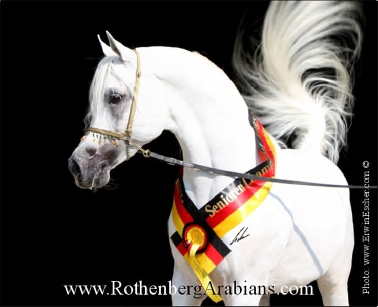 Goldprämierter, reinerbiger rein ägyptischer Vollblutaraber-Rapphengst GR ISHAD vom goldprämierten Rapphengst GR Nashad (Kuwait) aus einer Tochter des berühmten Multi-Champions Classic Shadwan! Exotisch im Typ, Größe, super Gebäude & Bewegungen, ein fantastischer Charakter, bewährtes Spitzenpedigree sowie üppiges Langhaar zeichnen ihn aus! Seine Fohlen sind bereits bei Züchtern auf 3 Kontinenten zuhause! Zeitweise Samenversand in bester Qualität, Lebendfohlengarantie (Nachbedeckung im Folgejahr, Hengstwechsel nach Absprache möglich). In der laufenden Decksaison stehen Ihnen insgesamt 15 rein ägyptische Hengste zur Verfügung - teils bei uns im Gestüt, teils auswärts auf Deckstation bzw. über Frischsamenversand und zum Teil auch mittels Gefriersamen - insgesamt 11 Rappen ! Weltbekannte Spitzenhengste teils gold-prämiert / Körungssieger, teils mit großen Schauerfolgen sowie erfolgreicher Nachzucht in der ganzen Welt! Rappen (teils reinerbig) / Braune / Schimmel! Alle Hengste sind SCID & CA frei, Decktaxen ab Euro 700,- (je nach Hengst und Rasse / Abstammung der Stute) - genaue Deckbedingungen auf Anfrage. Außerdem haben wir sowohl aus unserer eigenen, weltweit erfolgreichen Zucht sowie von Deckkunden immer wieder Fohlen, Jung- und auch Zuchtpferde anzubieten - mehr Infos teilweise auf unserer Homepage www.Gestuet-Rothenberg.de bzw. alle aktuellen Verkaufspferde auf Nachfrage. Nähere Infos gerne telefonisch unter 0049 / 0 90 91 / 37 07 oder per e-mail (bitte Anfragen per e-mail NUR mit vollständigem Namen und Adresse - danke!). Folgen Sie uns auf Instagram: @RothenbergArabianStud