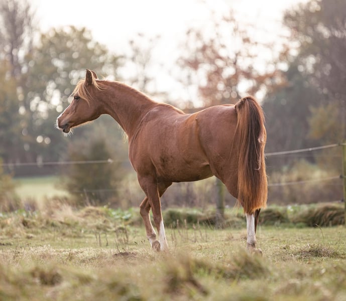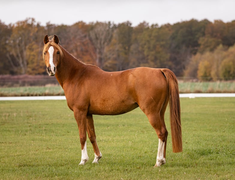 Waliyyah APN is a beautiful chestnut OX Arabian mare with incredible floating gaits, where her trot in particular can be highlighted. She clearly shows heat and is a very good mother. She has produced a beautiful well-moving crossbred in 2023 by an Akhal Teke stallion, Mudaris. She is very well suited to breeding due to her mind and gaits, plus an impressive pedigree. Waliyyah has been ridden earlier in her life and has started distance events up to 40 km. However, du to an early injury as a foal has limited her suitability for riding. She has not been under saddle in 5 years, but could perhaps be started again for easy leisure riding. Her main potential though is as a broodmare or a companion horse. She is a beautiful mare with an equally beautiful mind. She is smart, cool, sensitive with an incredible on/off switch. Her full pedigree can be seen here: https://beta.allbreedpedigree.com/waliyyah-apn-T8jqPh62/pedigree