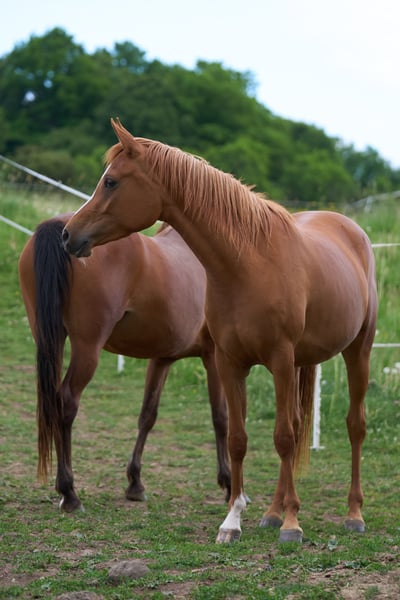 Mireya has been bred with the goal of becoming a good riding horse. She predominantly comes from Russian lines. From this dam line, we have horses that compete in endurance up to LDR, in dressage up to class S, and in leisure sports. Depending on how they are trained, they offer a wide range of possibilities. The sire, A Magic Man of Kossack, was the highest-rated stallion of the association for two consecutive years. More detailed and always up-to-date information is available on the Vogelsberg Arabians' website. Mireya has grown up on large pastures in mixed herds. She has had a stress-free life so far and has been treated lovingly by us humans. She trusts us and responds very sensitively in handling. In the hierarchy, she is rather in the middle here.