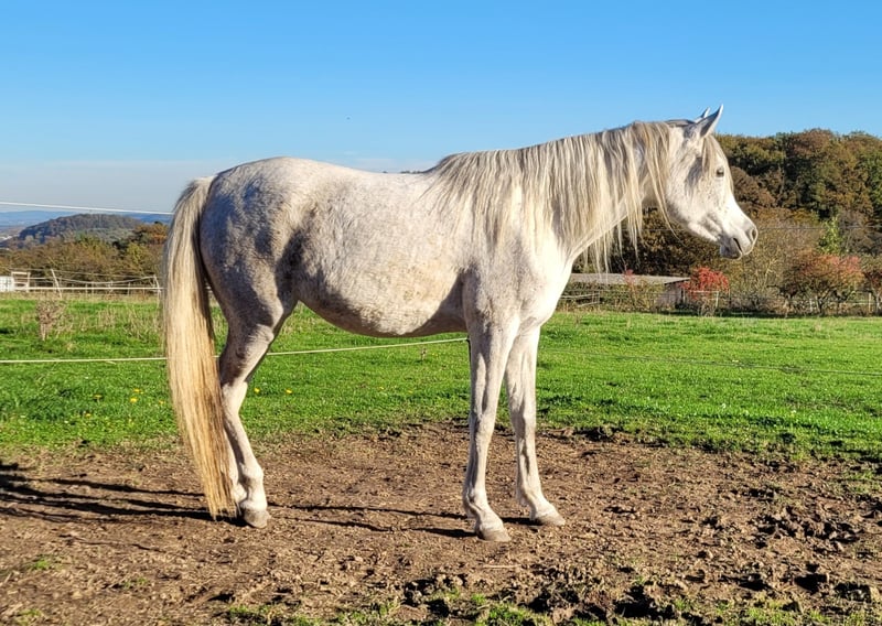 Verkaufe Vollblutaraber-Stute – Fliegenschimmel, Geburtsjahr 2019 Diese elegante Vollblutaraber-Stute besticht durch ihre anmutige Erscheinung und ihre hervorragende Zuchtlinie. Geboren im Jahr 2019, ist sie eine vielversprechende Zuchtstute mit einem beeindruckenden Stockmaß von 154 cm. Ihr wunderschöner Fliegenschimmel-Farben macht sie zu einem echten Blickfang. Sie ist bestens geeignet für die Zucht und überzeugt durch ihre gute Abstammung sowie ihr angenehmes Wesen. Die Stute ist gesund, regelmäßig geimpft und frei von bekannten Krankheiten. Sie hatte letztes Jahr ein schönes Stutfohlen. Wegen eines kleinen Schönheitsfehler zu einem moderaten Preis abzugeben Bei Interesse oder für weitere Informationen stehe ich gerne zur Verfügung. Besichtigungen sind nach Vereinbarung möglich.
