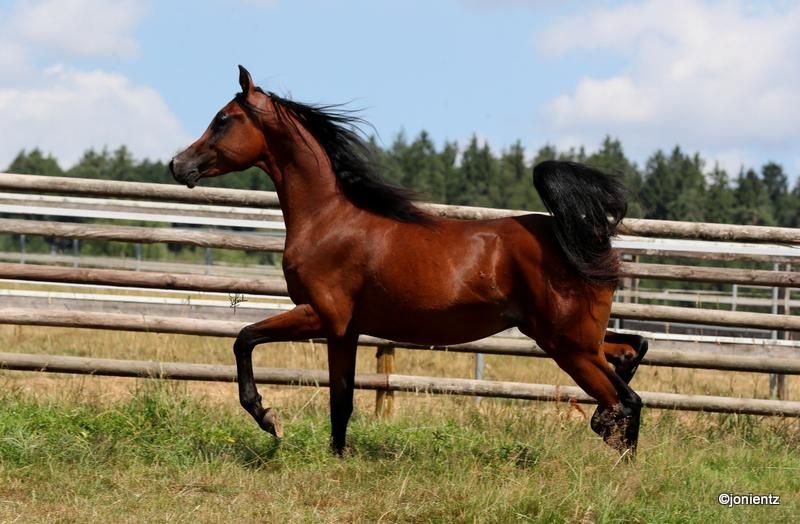 Talal El Mujid est un magnifique jeune étalon égyptien brun issu d'un élevage de premier choix avec des lignées très intéressantes. Il réunit les caractéristiques typiques de cette noble race : intelligence, grâce et un tempérament doux. Il possède une excellente conformation et un bon équilibre, ainsi que des mouvements exceptionnels, ce qui le rend adapté à la fois pour la reproduction et pour les loisirs. Talal est très charmant, bien socialisé, vit en grande troupeau et se montre calme et amical dans ses interactions. Il est déjà habitué au licol et à l'entraînement à la conduite, et montre un grand potentiel pour une formation ultérieure. Si vous êtes intéressé, nous serions ravis de vous contacter pour partager plus d'informations et convenir d'un rendez-vous pour une visite. www.goschenhof-arabians.de