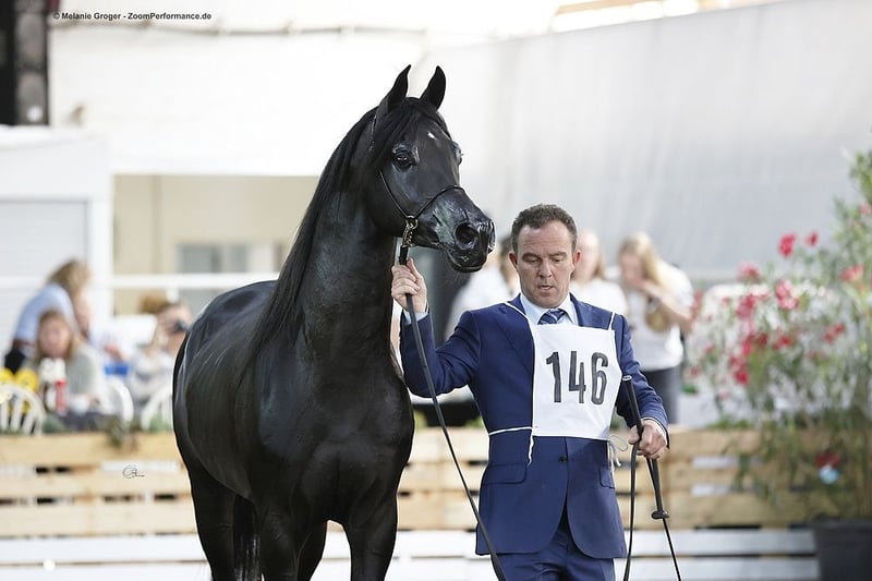 "Pueblo" es un hermoso y elegante caballo negro con una conformación correcta y excelentes aires. Pueblo fue importado por nosotros como semental de 3 años de Janow Podlaski y ha estado en uso de reproducción aquí (está registrado con cinta dorada). El año pasado decidimos darle una vida probablemente mejor como caballo de monta y castrado. Ahora está siendo trabajado regularmente bajo la silla y se muestra tranquilo y correcto tanto a la mano como montado. Se mueve en los tres aires básicos en la pista, así como también en el campo. Actualmente está en el prado con un caballo castrado, lo cual está funcionando muy bien. Por supuesto, Pueblo tiene papeles y pasaporte de équido, y está desparacitado y vacunado regularmente.