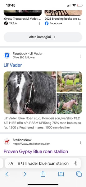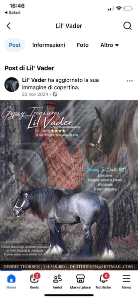 Seme congelato direttamente dagli USA, mi ha dato un puledro blue roan e mi sono rimaste due cartucce da 4 paiette ciascuna. Questo stallone ha dato sempre figli blue roan se la fattrice ha nel DNA il gene compatibele