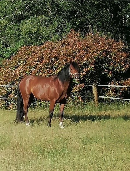 Beautiful 8-year-old gelding, 15.0 hh Potential for 11.0 hh to 11.3 hh Broken in two years ago, has worked a little in jumping (90 cm), cross-country (fences, tires, trunks, various heights, both uphill and downhill). A willing horse that enjoys learning. Due to lack of time, he has only been lunged for the past six months and needs to be brought back into work. Mother is a pony, sire is Zangersheide.
