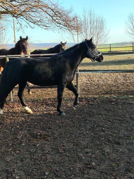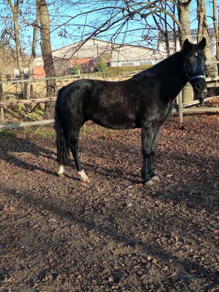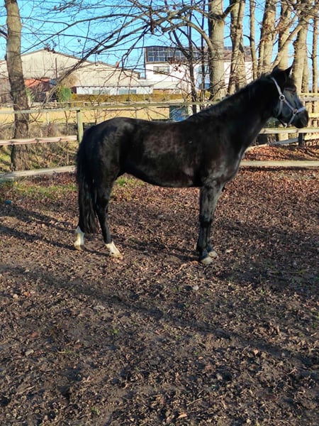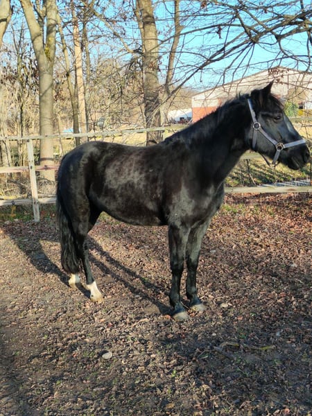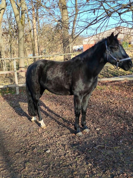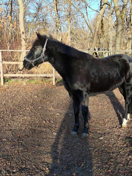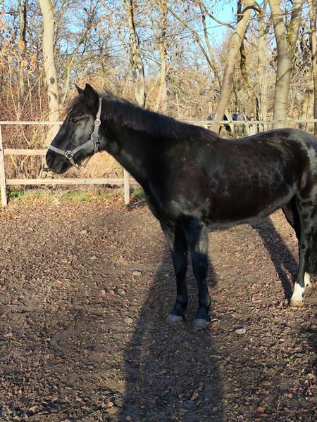 Beautiful, well-behaved mare in handling, also completely compatible with other horses. No history of founder. Regarding riding ability, I have no information, and no guarantee is provided, as unfortunately no one currently rides her at our stable. According to the previous owner before the previous one, the mare has been ridden and driven by him.