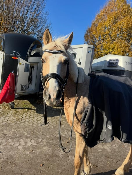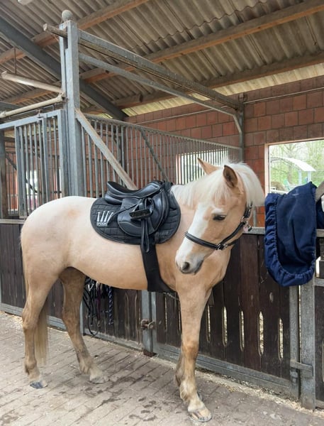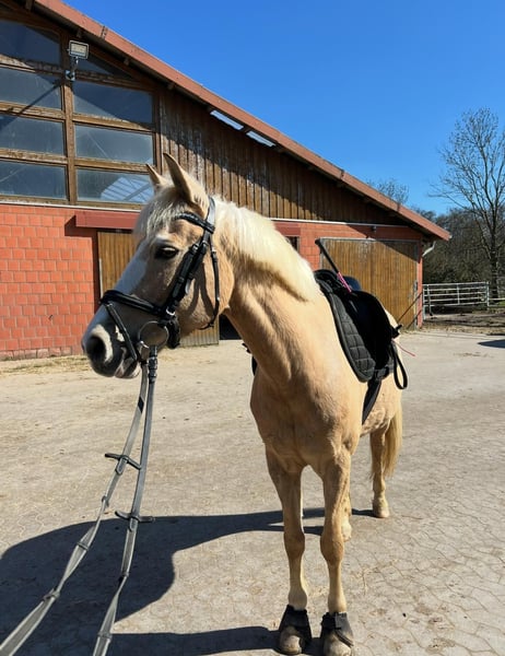 Palominostute Vilma sucht ein liebevolles neues Zuhause Schweren Herzens verkaufen wir unsere 15-jährige Palominostute Vilma. Niederländisches Reitpony. Sie ist ca. 1,41 m groß und eine motivierte, vielseitige Partnerin, die für jeden Spaß zu haben ist. Vilma zeigt sowohl im Springen als auch in der Dressur stets Arbeitsfreude und Motivation. • Springen: E–A-Niveau • Dressur: A** Vor 2020 ist sie zudem regelmäßig Turniere gegangen. Typisch Stute kann Vilma auch mal ihren eigenen Kopf haben. Deshalb wünschen wir uns für sie pferdeerfahrene Menschen, die sich fair, aber konsequent durchsetzen können. Dann ist sie eine tolle und zuverlässige Partnerin. Sehr wichtig ist uns, dass Vilma in ihrem neuen Zuhause regelmäßigen Weidegang bekommt und gut umsorgt wird. Platz vor Preis! Bei ernsthaftem Interesse freuen wir uns über eine Nachricht. Um Reittourismus vorzubeugen, berechnen wir für Besichtigung und Probereiten eine Aufwandsentschädigung von 25 €.
